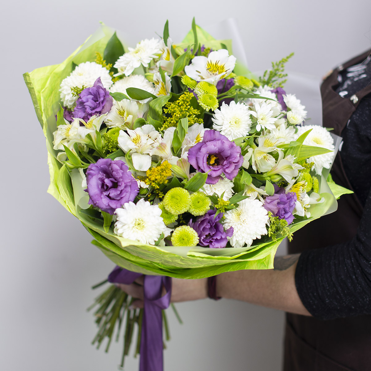 Букет из 10 альстромерий, 5 зеленых хризантем, 3 белых хризантем, 5 фиолетовых эустом, 5 солидаго в оформлении бумагой и фетром.Размер букета: 40*40 см