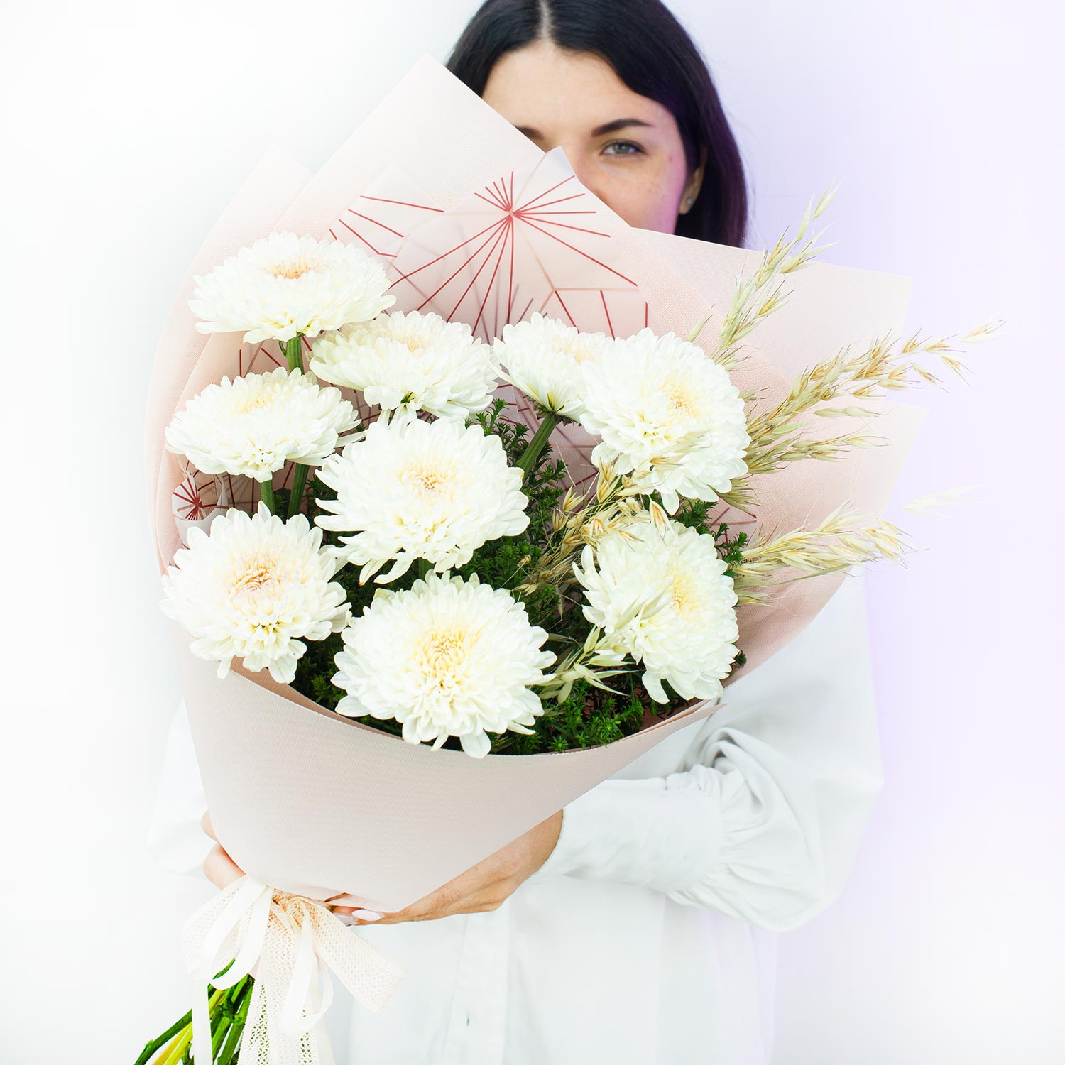 Букет из осенней коллекции в нежных бежевых тонах из сезонных хризантем, декоративной зеленью и сухоцветами.Состав букета: