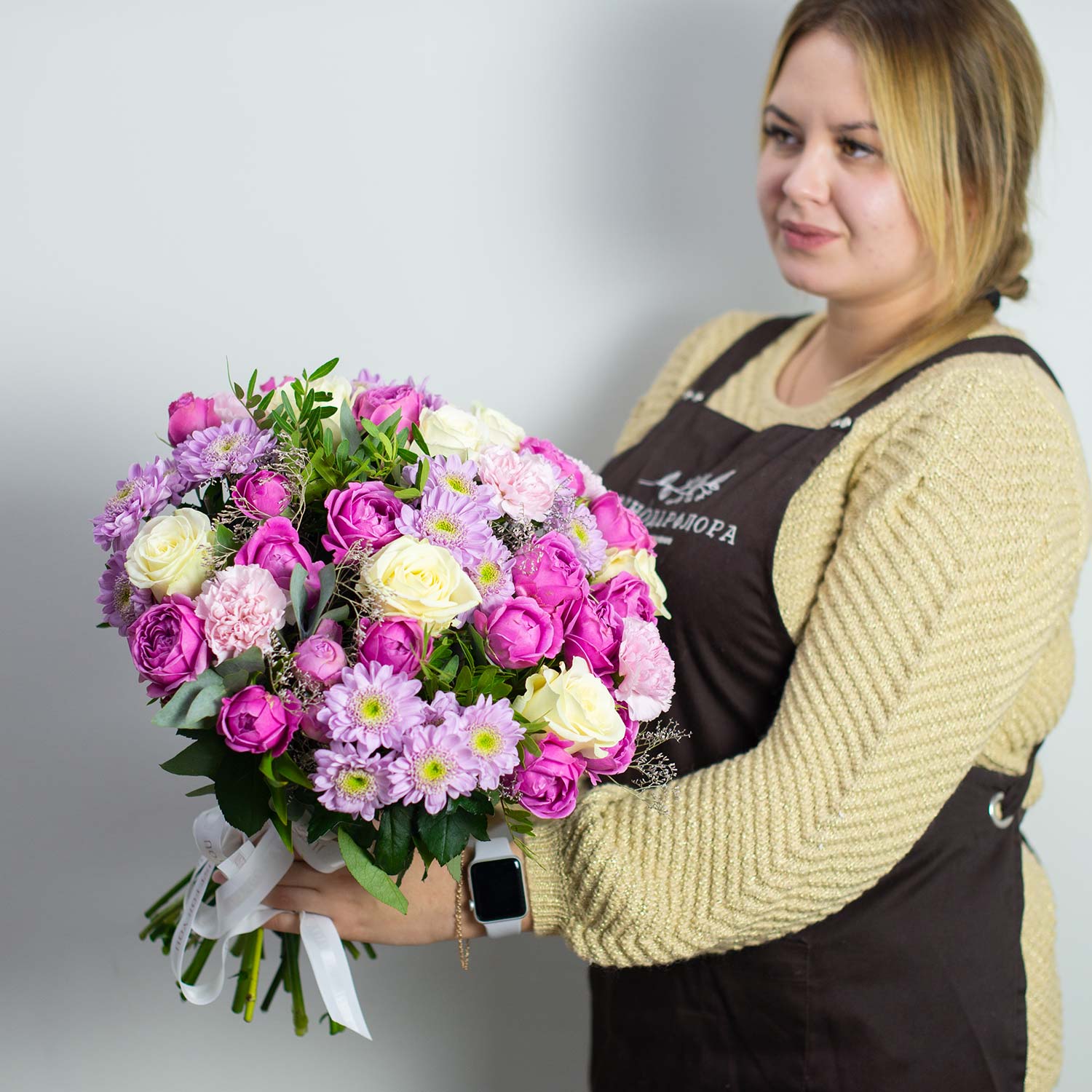 Букет из роз, гвоздик и хриантем. Без упаковки, букет перевязан атласной лентой.Состав букета: