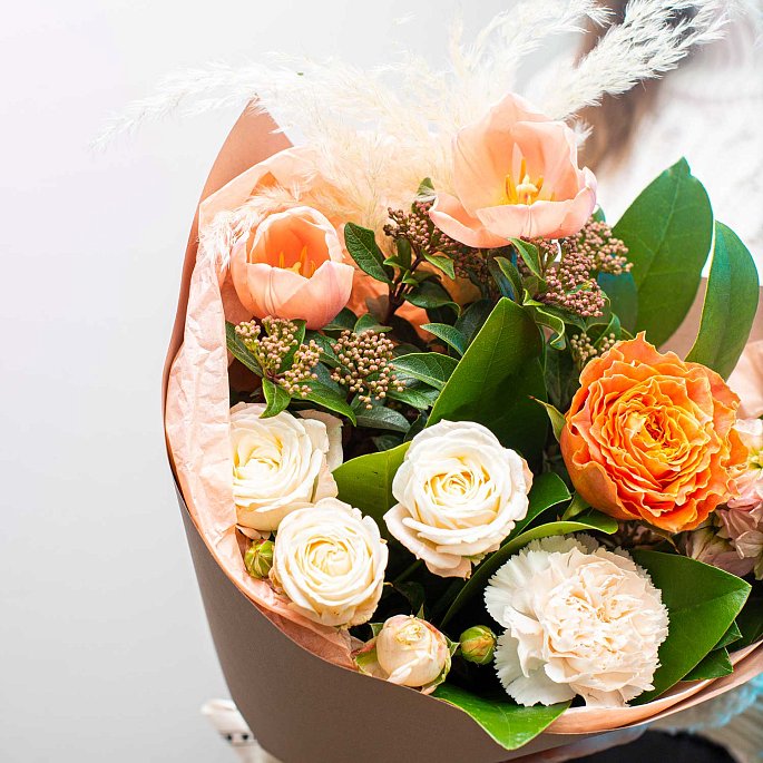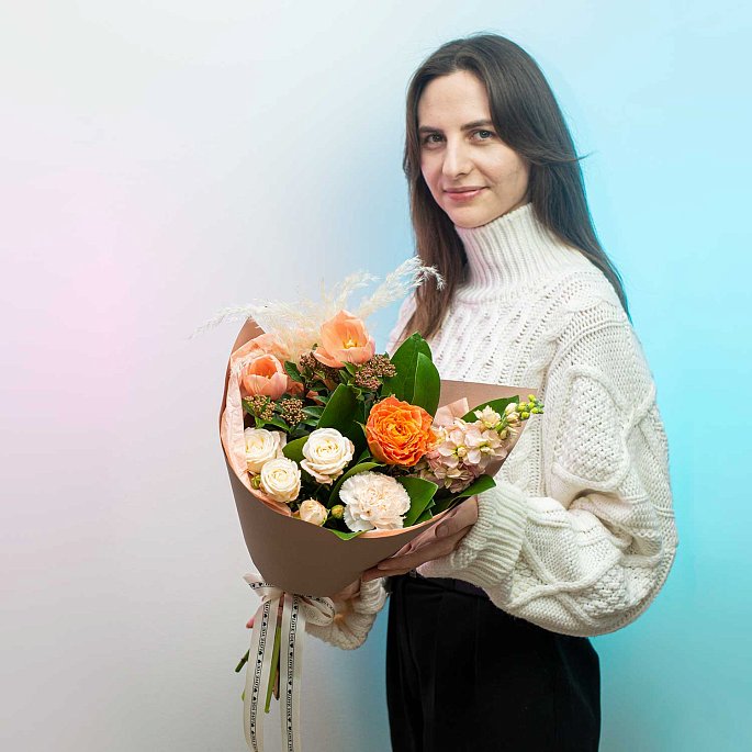 Небольшой букет в нежных тонах с яркими акцентами оранжевого цвета.Состав букета: