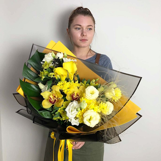 Букет в тропическиъ и желтых тонах с листом монстерры:Состав букета: