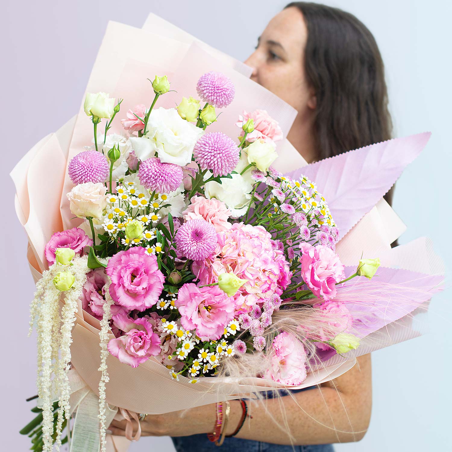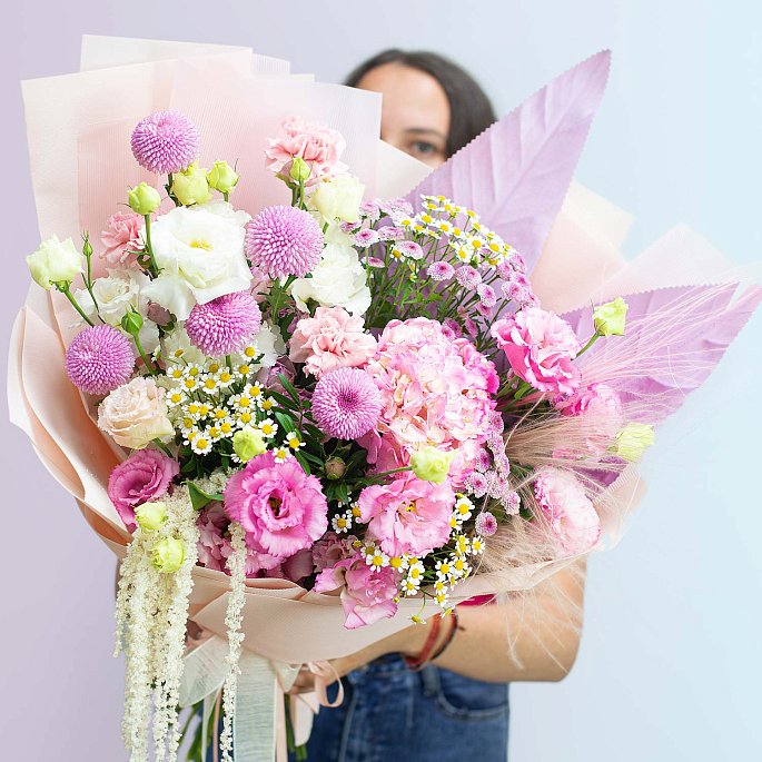 💖 Этот букет стоит добавить в Избранное! 💖Погрузитесь в мир нежности и изящества с букетом "Розовая фантазия". Эта утончённая композиция объединяет в себе розовые гортензии, хризантемы, изысканные эустомы, романтичные диантусы и трогательные соцветия ромашек, дополненные легкостью декоративных элементов. Идеальный выбор для создания атмосферы радости и нежности!