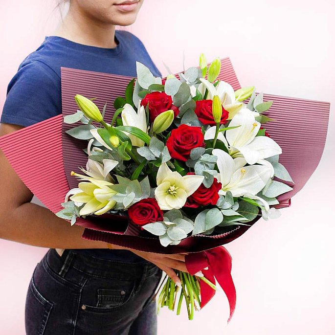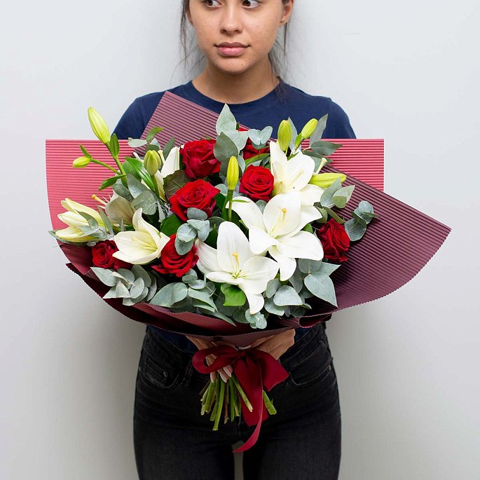 Букет из лилий, контрастные красные розы, эвкалипт. Дизайнерская упаковка.Состав букета: