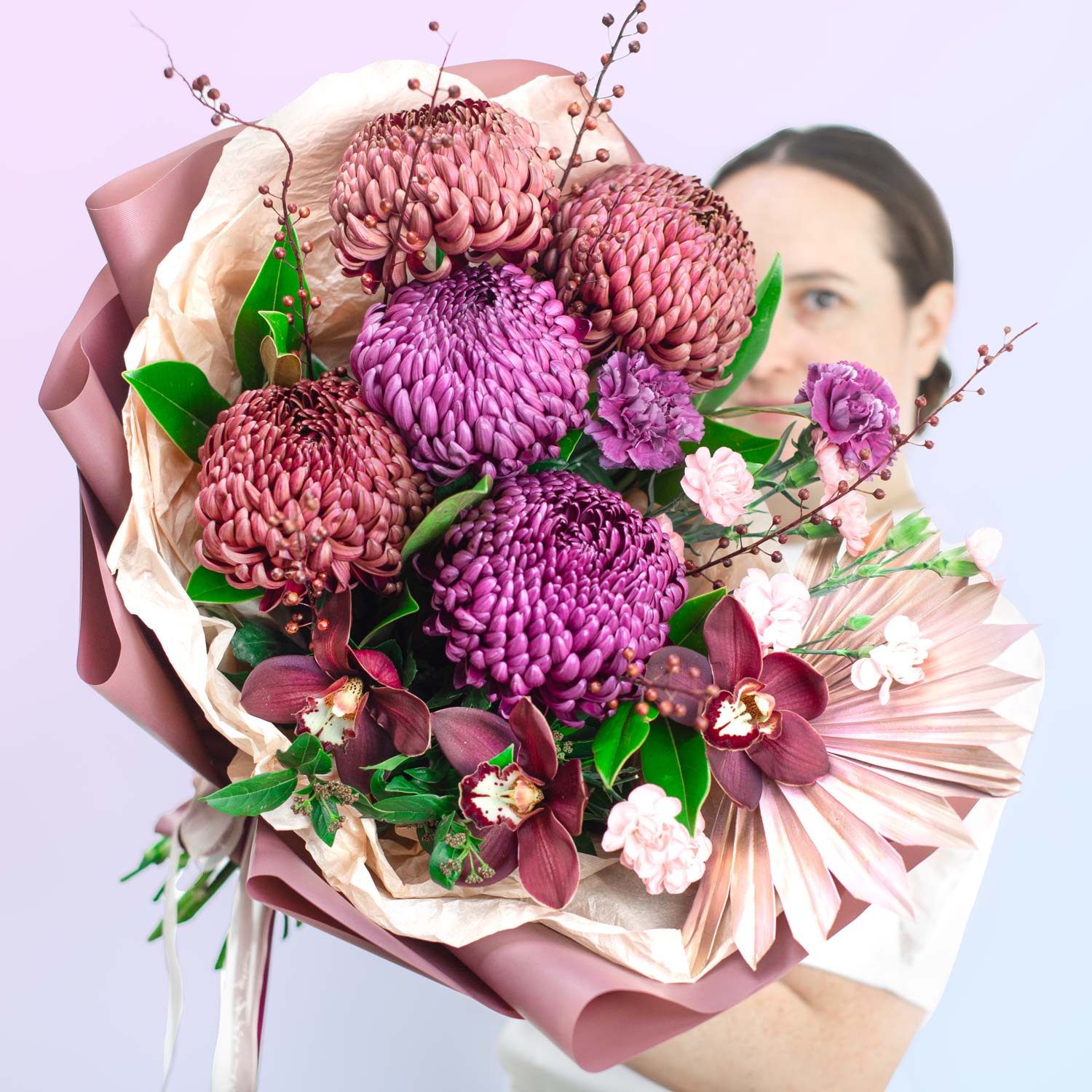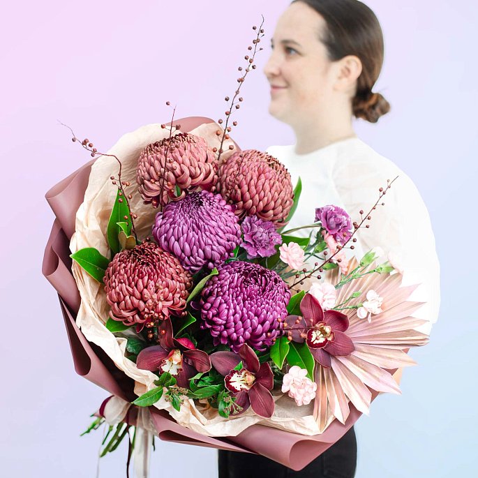 💖 Этот букет стоит добавить в Избранное! 💖Погрузитесь в мир изысканности и утончённости с этим роскошным букетом. Пышные хризантемы сорта "Бигуди", благородные орхидеи и нежные диантусы объединены с декоративным листом пальмы и зеленью, создавая композицию, которая очаровывает с первого взгляда.