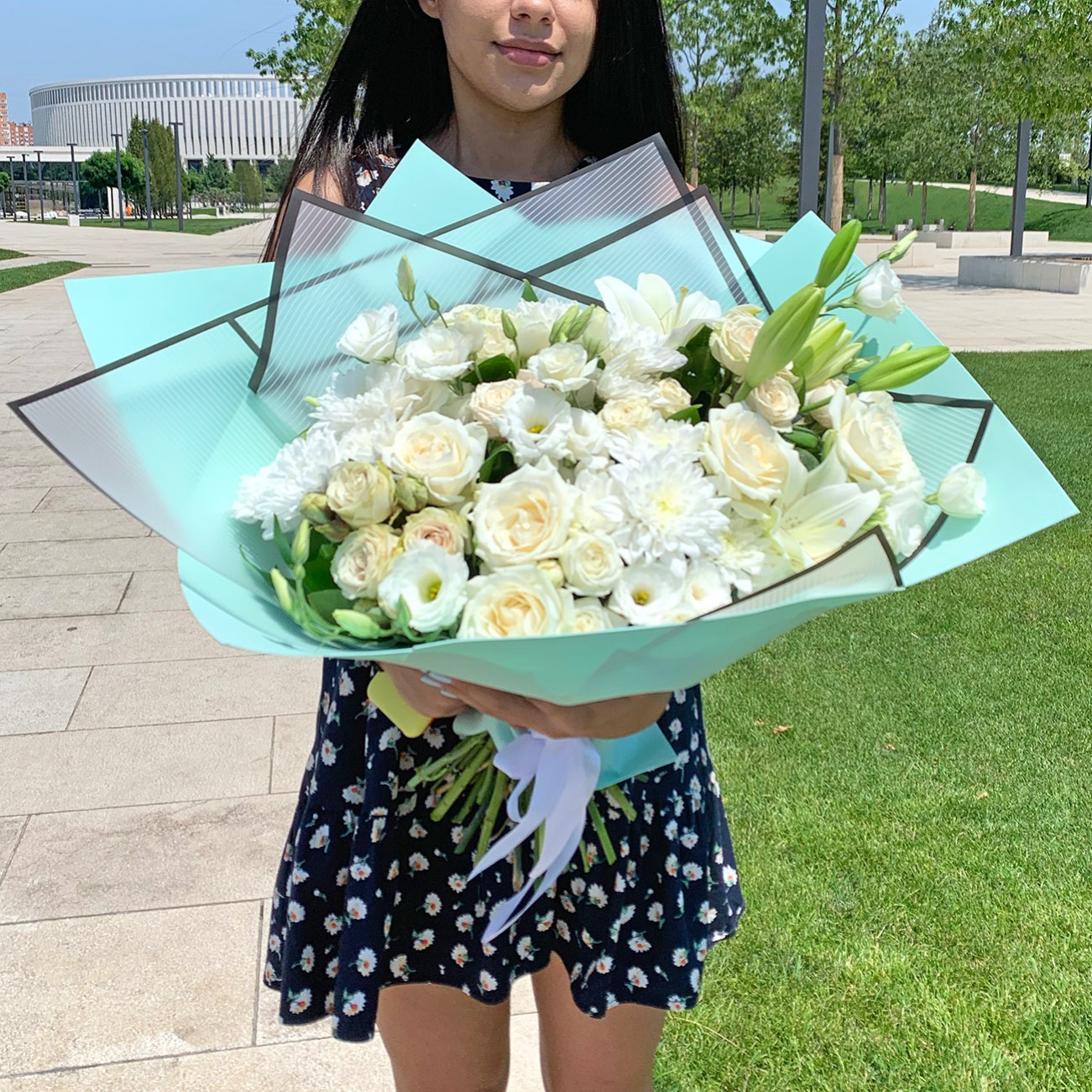 Великолепный букет только из белых цветов.Состав: 2 белые лилии, 7 белых роз "Аваланж", 5 белых кустовых роз, 3 белых хризантемы "Зембла", 7 белых эустом в упаковке дизайнерская пленка и фоамиран.