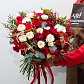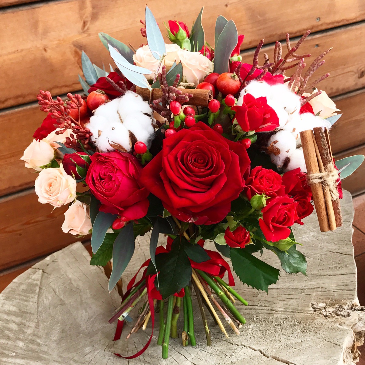 Теплый и согревающий букет из 5 роз "Ред Наоми", 5 кустовых роз, 3 пионовидных роз, 3 белых хлопка, 2 палочки корицы, зелени эвкалипта, декоративных элементовРазмер букета: 25*25 см