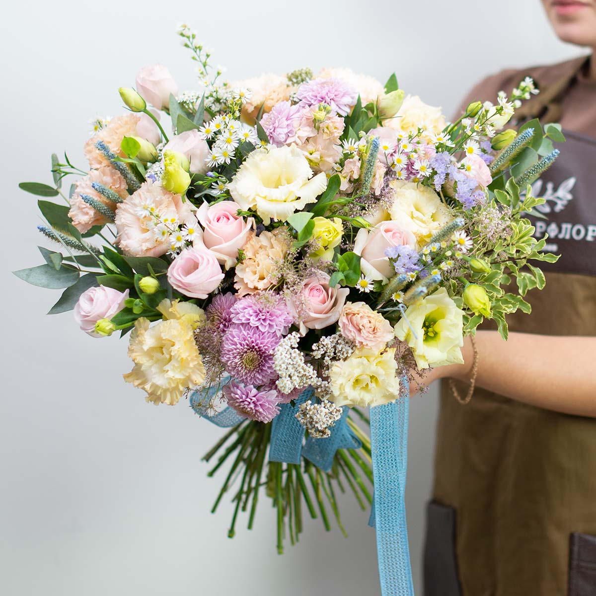 Легкий летний букет с воздушными эустомами, нежными розами в сочетании с матрикарией и зеленьюСостав букета: