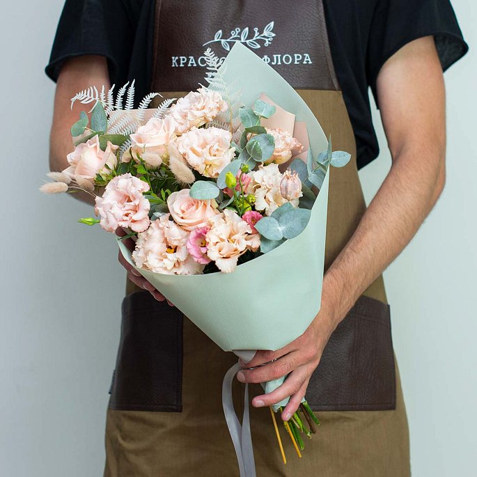 Нежный букет в пастельных тонах с ароматным эвкалиптом, розой и эустомой.Роза "Кимберли " - 3 шт.