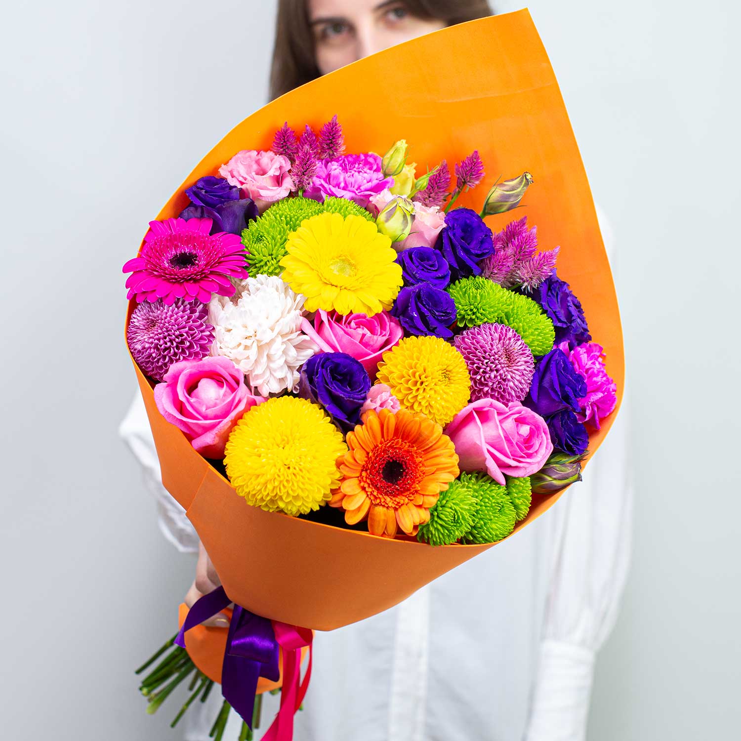 Очень яркий букет, который поднимает яркость и насыщенность на новый уровень! Плюс наши флористы выбрали контрастную оранжевую упаковку, что делает букет еще более крутым.Оттенки и цветы могут незначительно меняться.