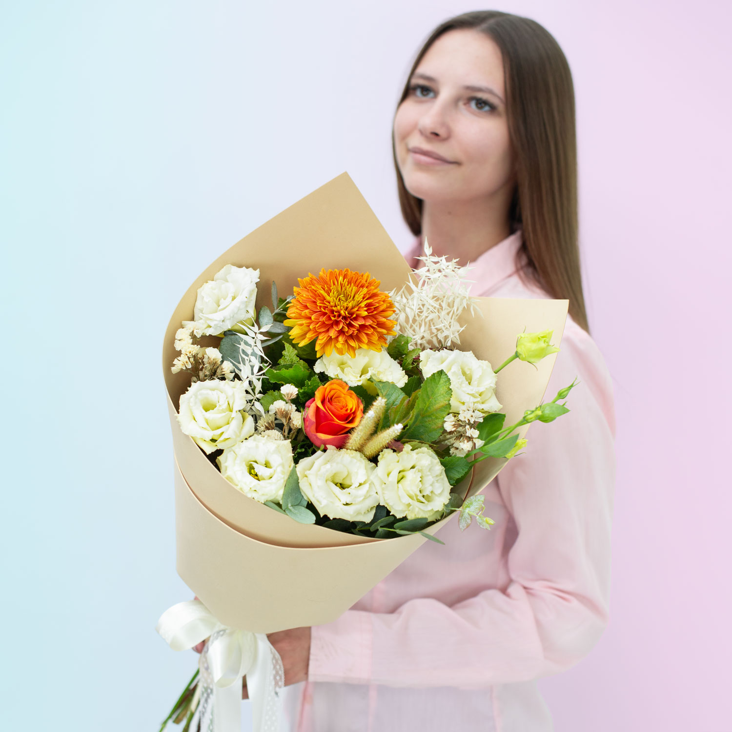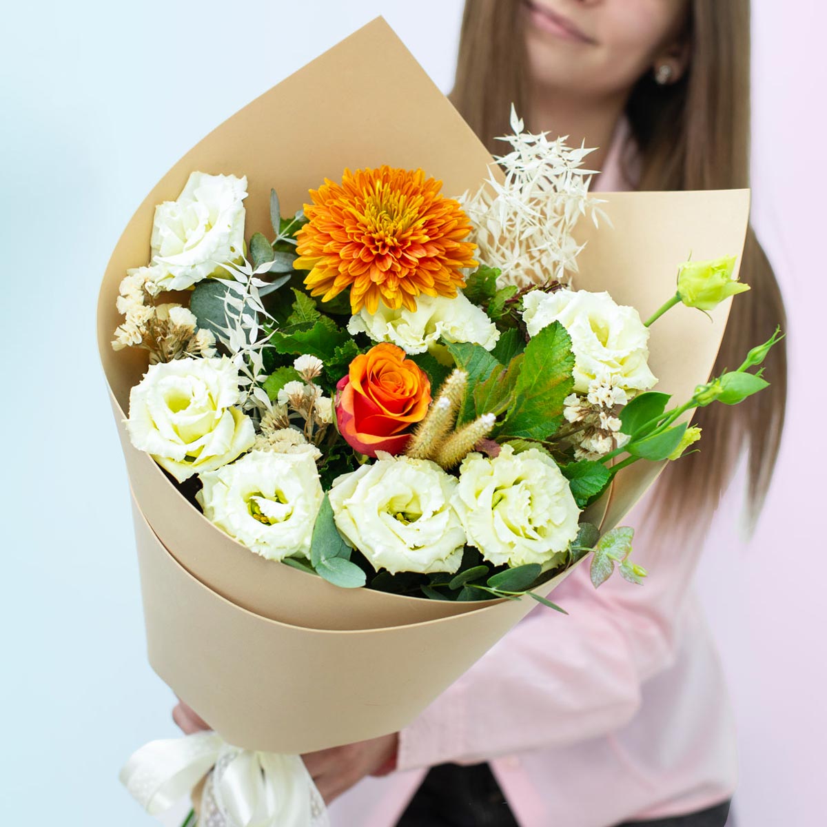 Сезонный букет из кремовой эустомы, розы и хризантемы с декоративными элементами.Примерный диаметр: 25-27 см