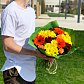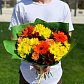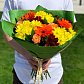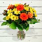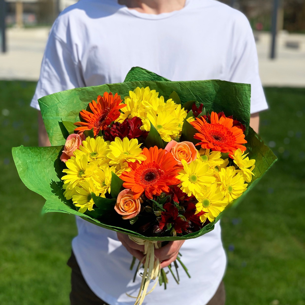 Букет из 3 оранжевых гербер, 3 роз "Мисс Пигги", 3 желтых кустовых хризантем, 3 красных альстромерий. Упаковка жатая бумага.Диаметр букета - 30 см.
