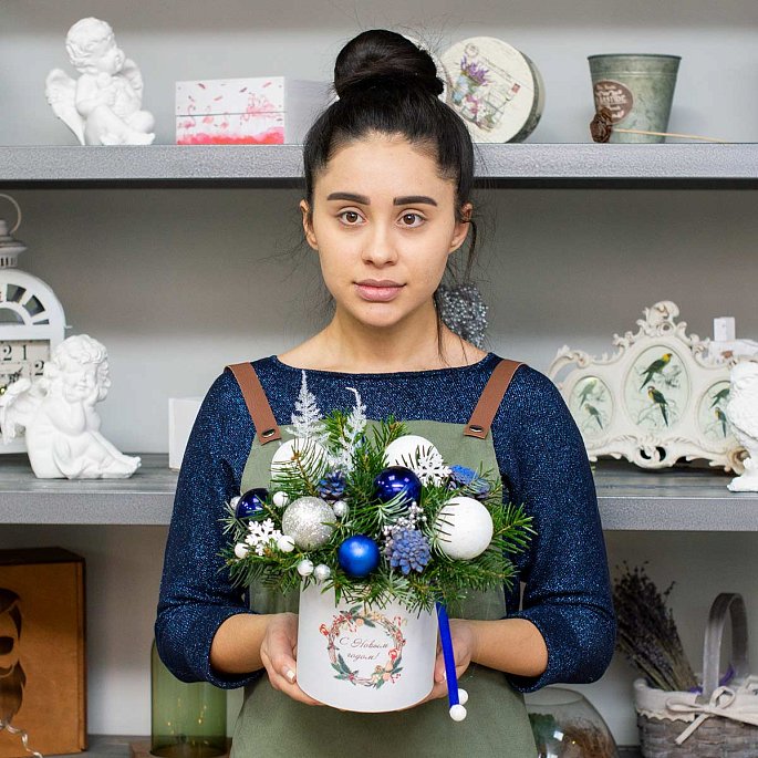 Небольшой новогодний цилиндр "С Новым годом" с ароматными еловыми веткам, белыми и синими елочными шарами, шишкамиСостав композиции: