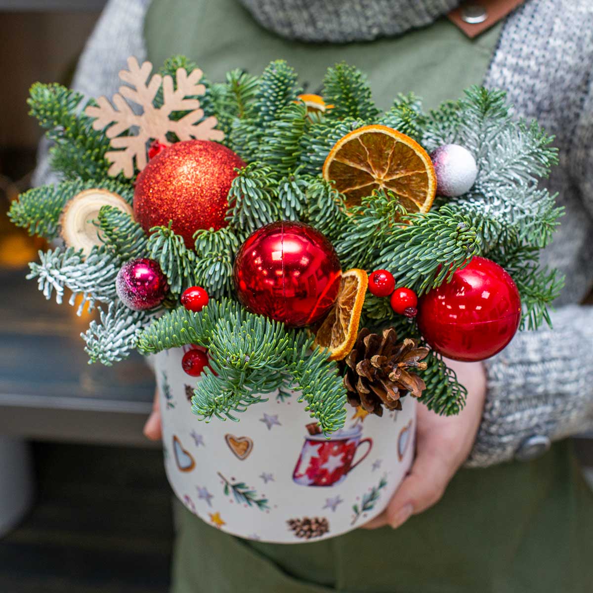 Небольшой новогодний цилиндр с ароматными еловыми веткам, елочными шарами, сушеными дольками апельсинок, шишками, натуральным деревом и декоративными ягодамиПримерный диаметр композиции: 25 см