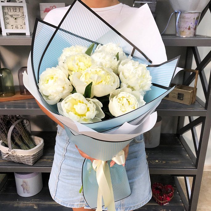 Букет из 9 белых пионов, дизайнерская пленкаПримерный размер букета:25*25 см