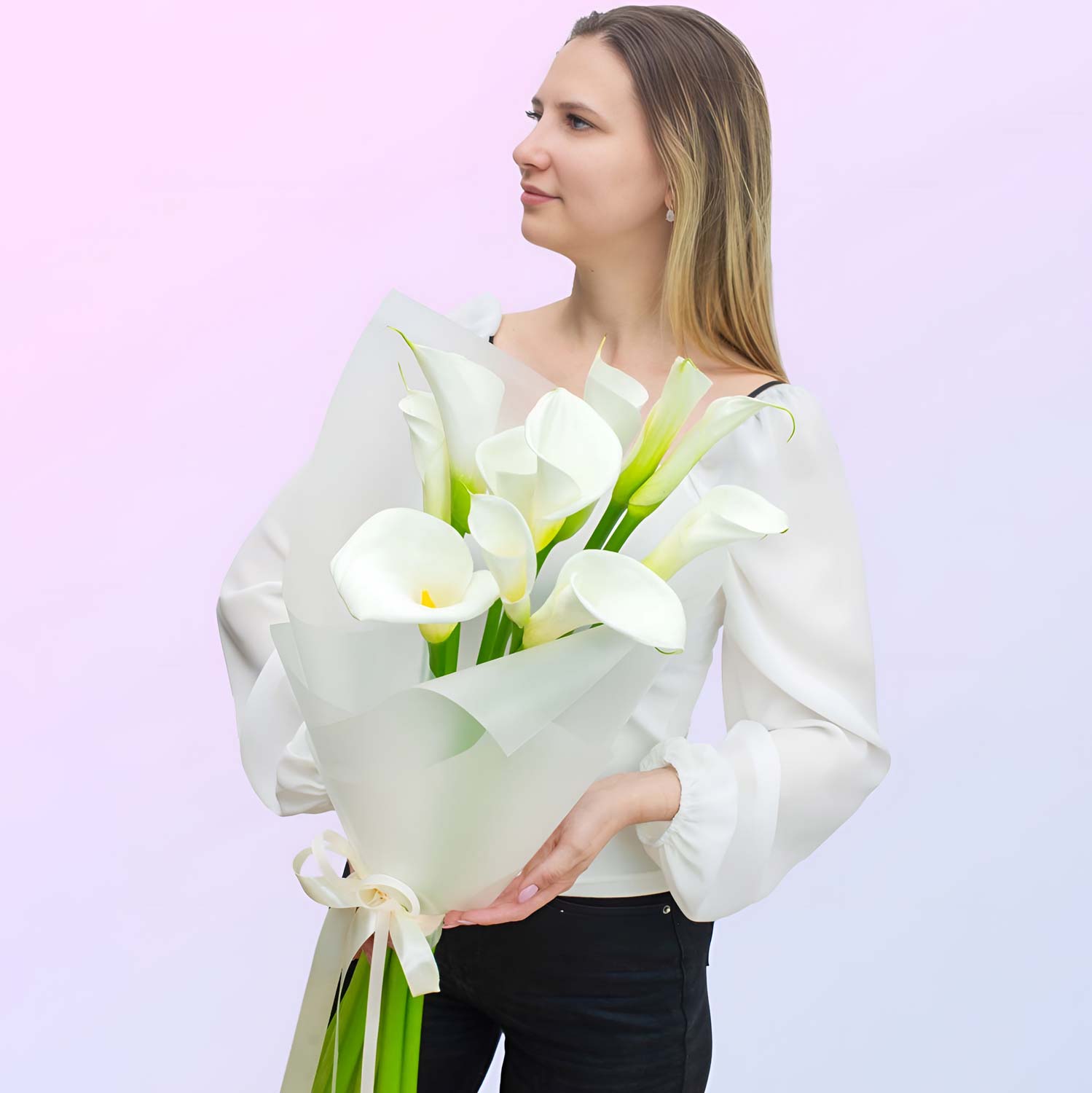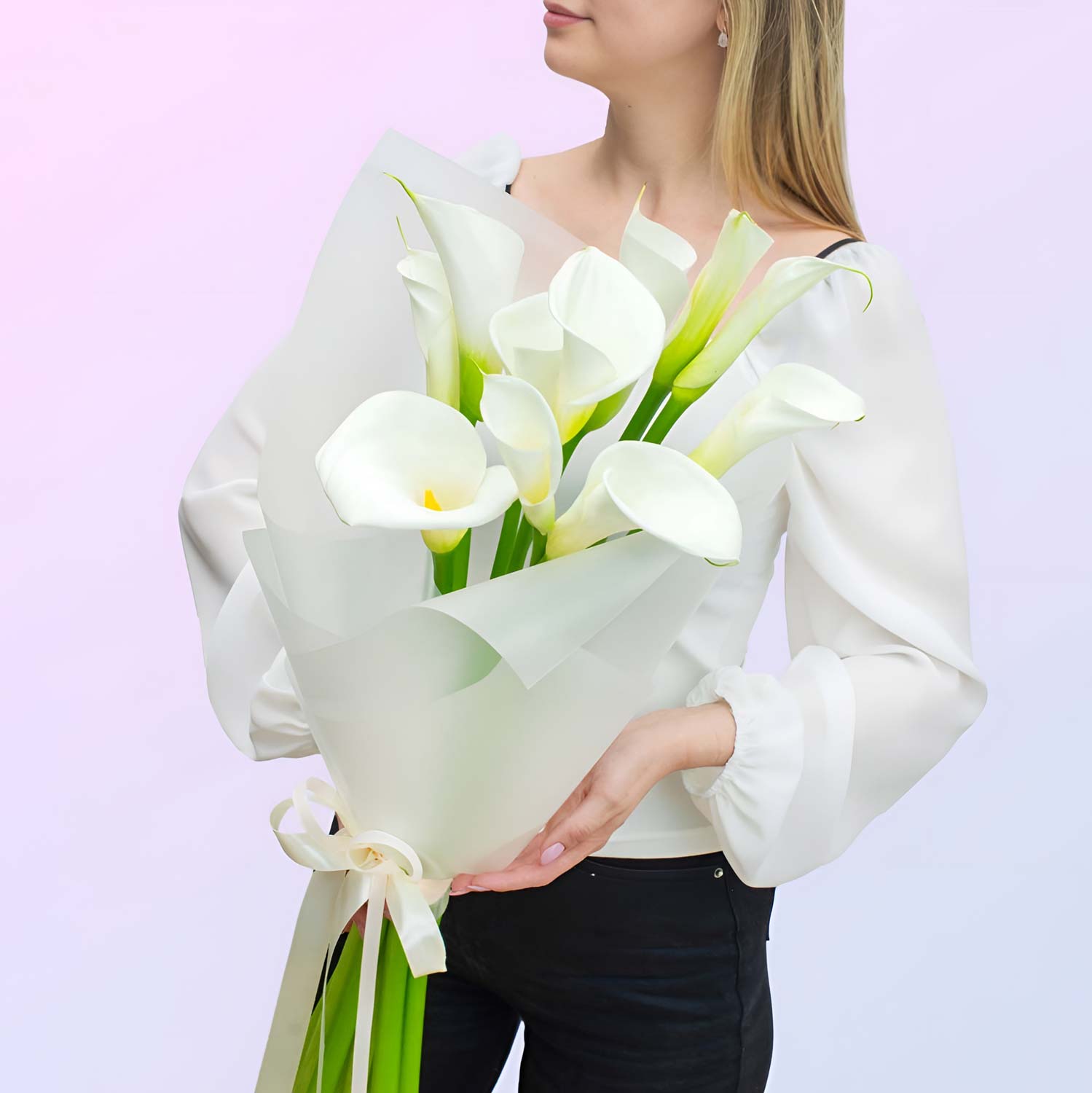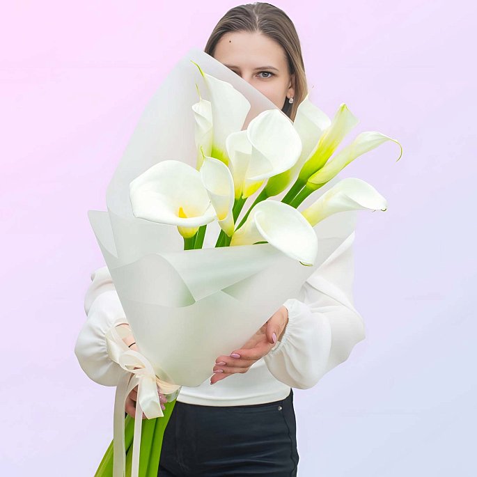 Стильный и минималистичный букет из 11 калл это выбор для тех, кто ценит изысканность и простоту. Чистый белый цвет делает композицию универсальной и подходящей для любого случая.