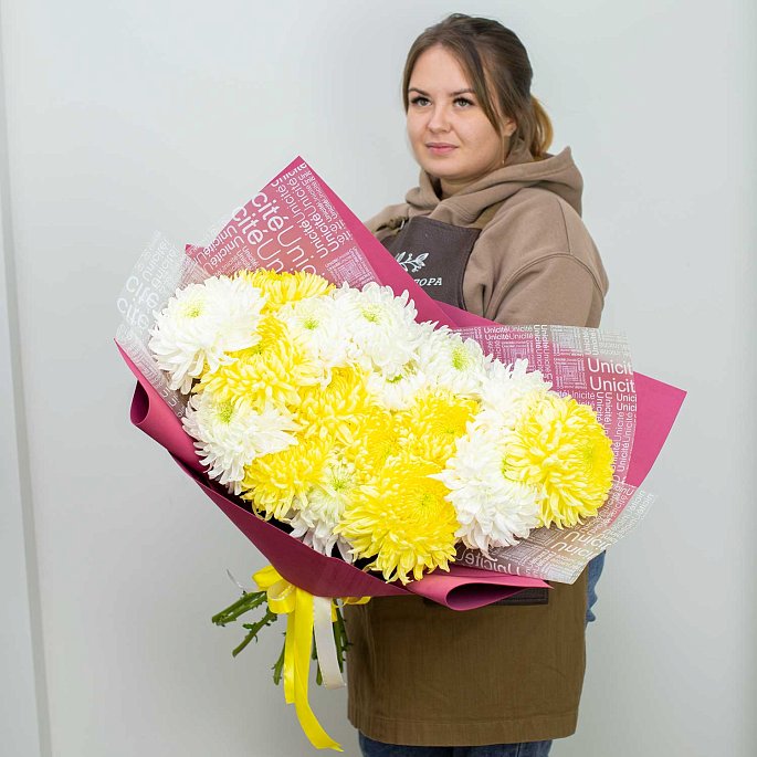 Букет из 19 белых и желтых крупных хризантем