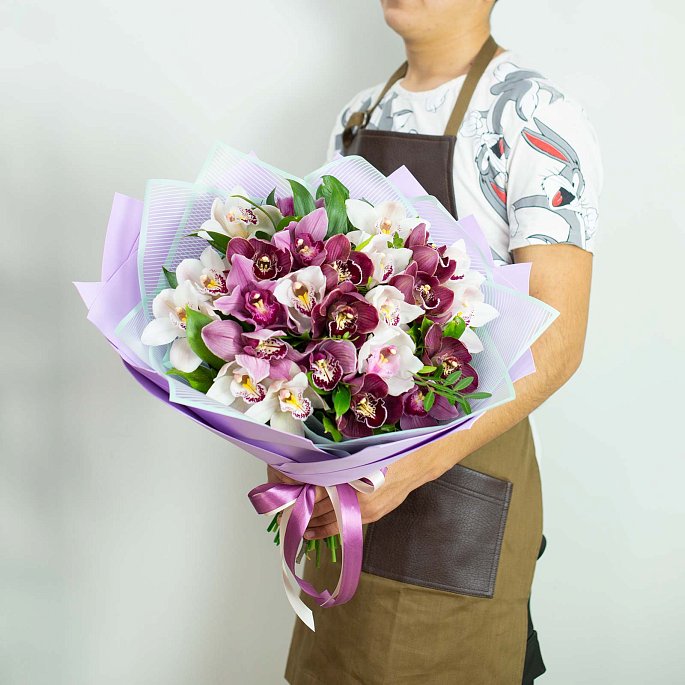 Большой букет из 25 цветков орхидей разных оттенков. Зелень для объема букета и упаковка - дизайнерская пленка и фоамиран.Для продления стойкости букета из орхидей используются специальные удлинительные колбы с водой.