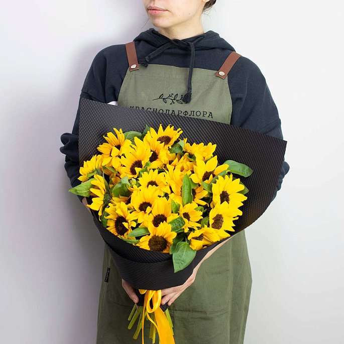 Яркий и контрастный букет из 25 подсолнухов в оформлении рифленая черная бумага.Примерный диаметр букета: 35 см