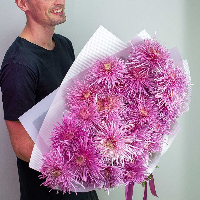 Большой букет из 27 крупных искристых игольчатых хризантем.Наши флористы были просто в восторге от этих минивселенных!