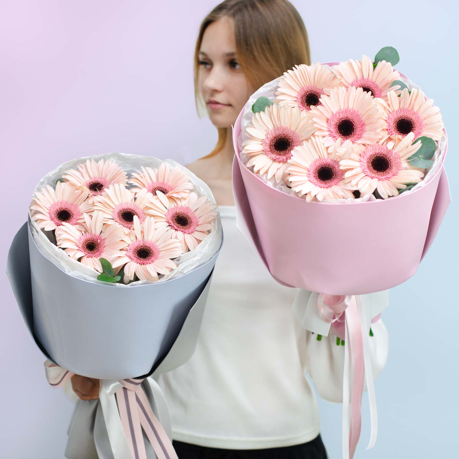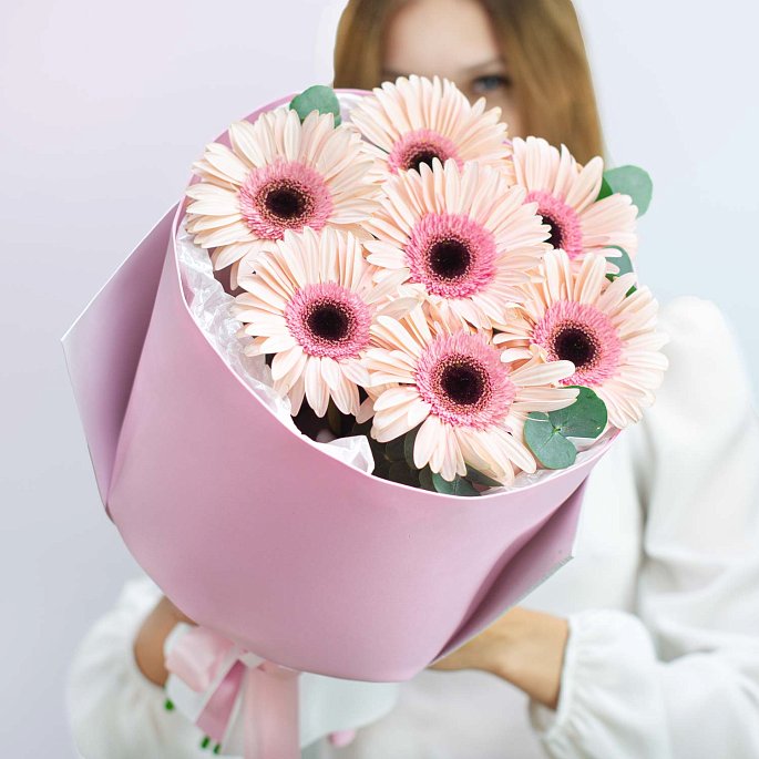 💖 Этот букет стоит добавить в Избранное! 💖Представляем вам букет из нежных гербер, который очаровывает своей простотой и элегантностью. В этой композиции сочетаются нежные розовые герберы, дополненные зеленью эвкалипта, что придает букету свежесть и легкость.