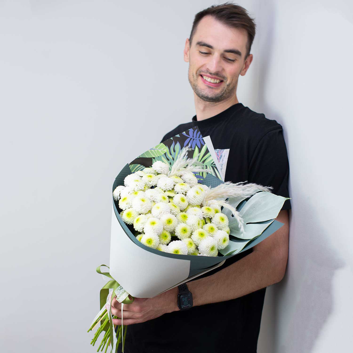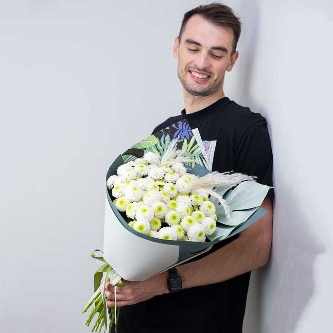 Букет из кустовых хризантем с листом монстеры и пампасной травой.А еще мы их упакуем в крутую упаковку с разными фактурами и атласными лентами и добавим декора.