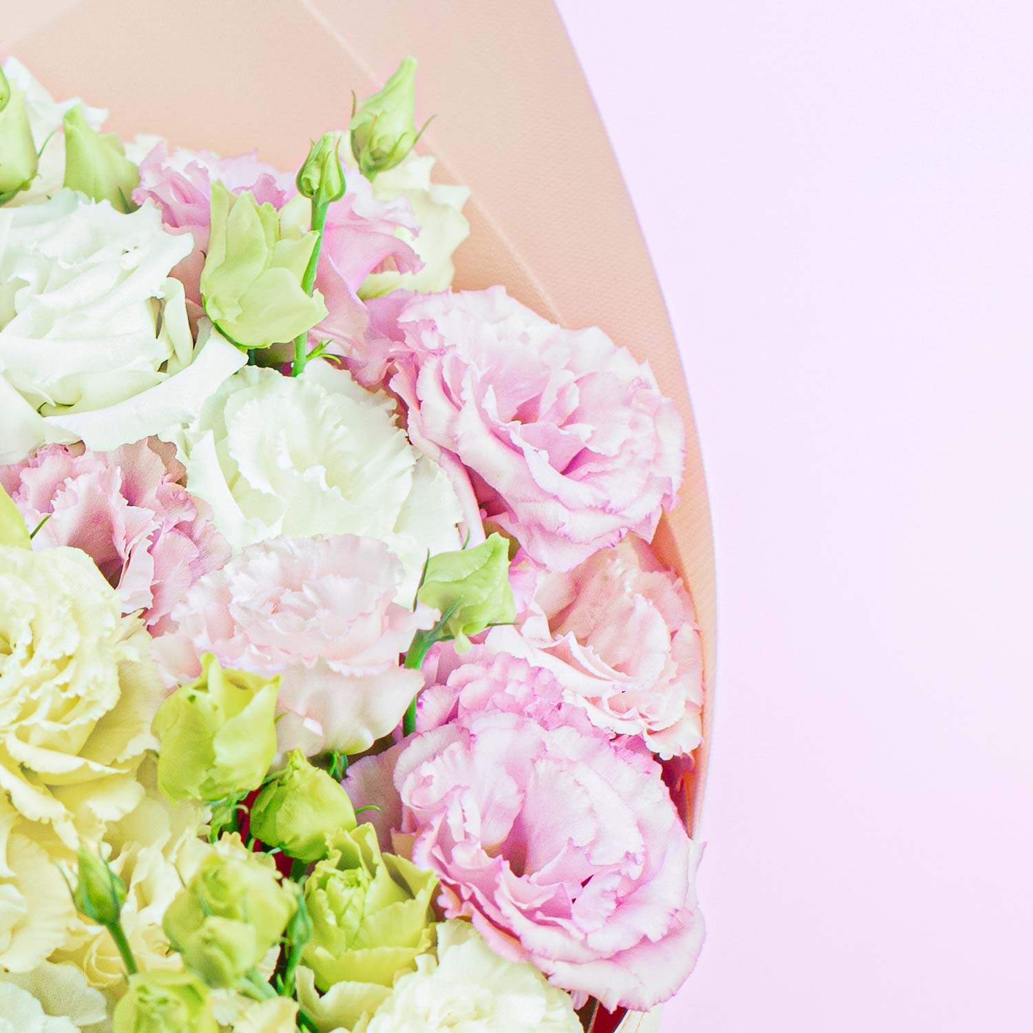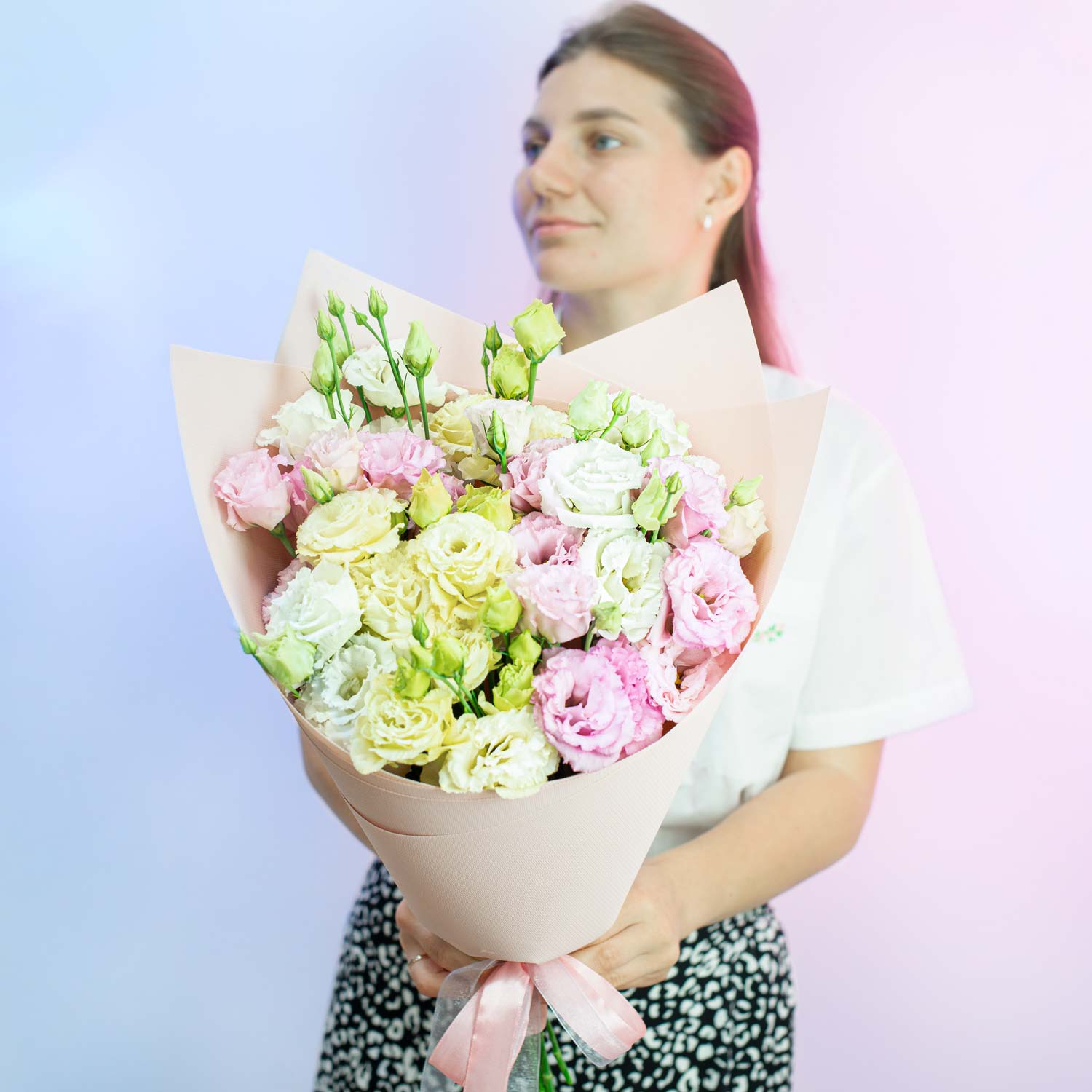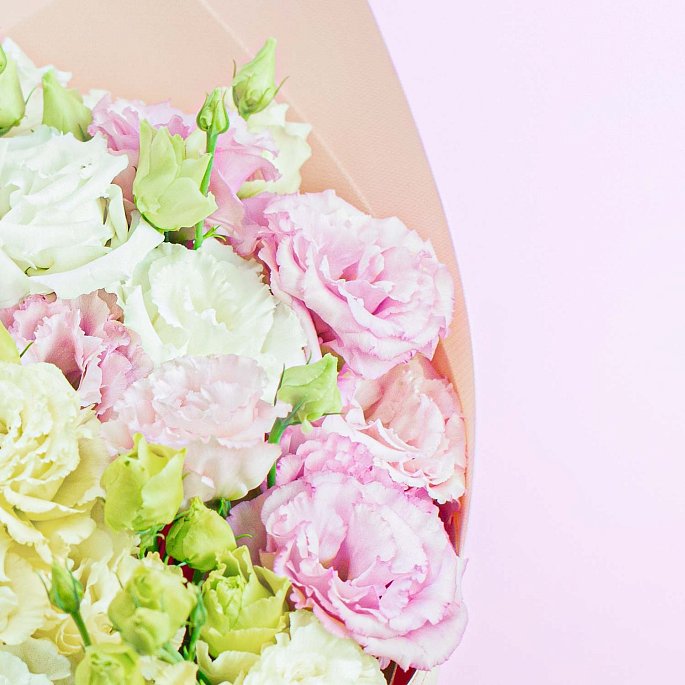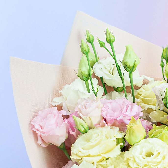 Сезонный букет из разноцветных эустом в нежных оттенках.Розовая эустома напоминает о мягком кружеве, добавляя романтический и воздушный акцент в букет.