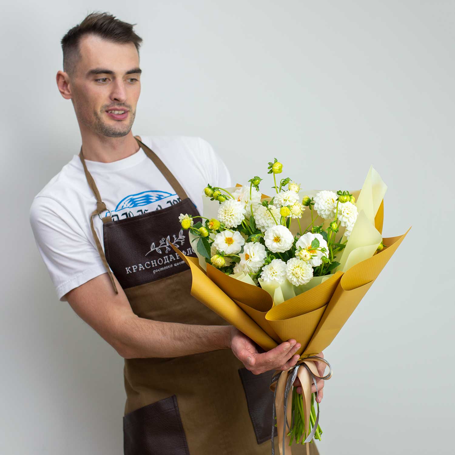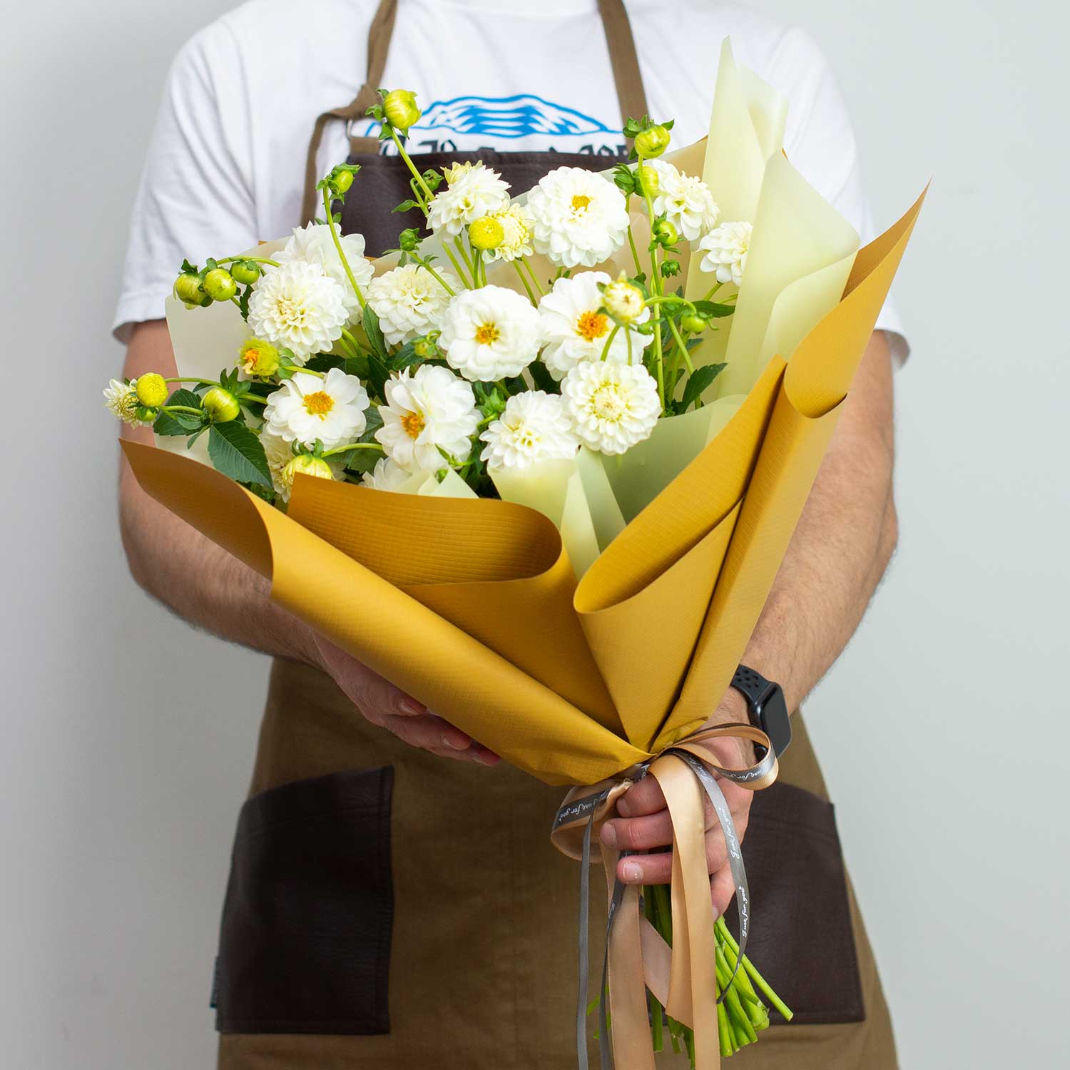 Классная находка наших флористов - белые небольшие кустовые георгины с бутонами.Букет выглядит очень воздушно и по-летнему. Также добавили контрастную горчичную упаковку.