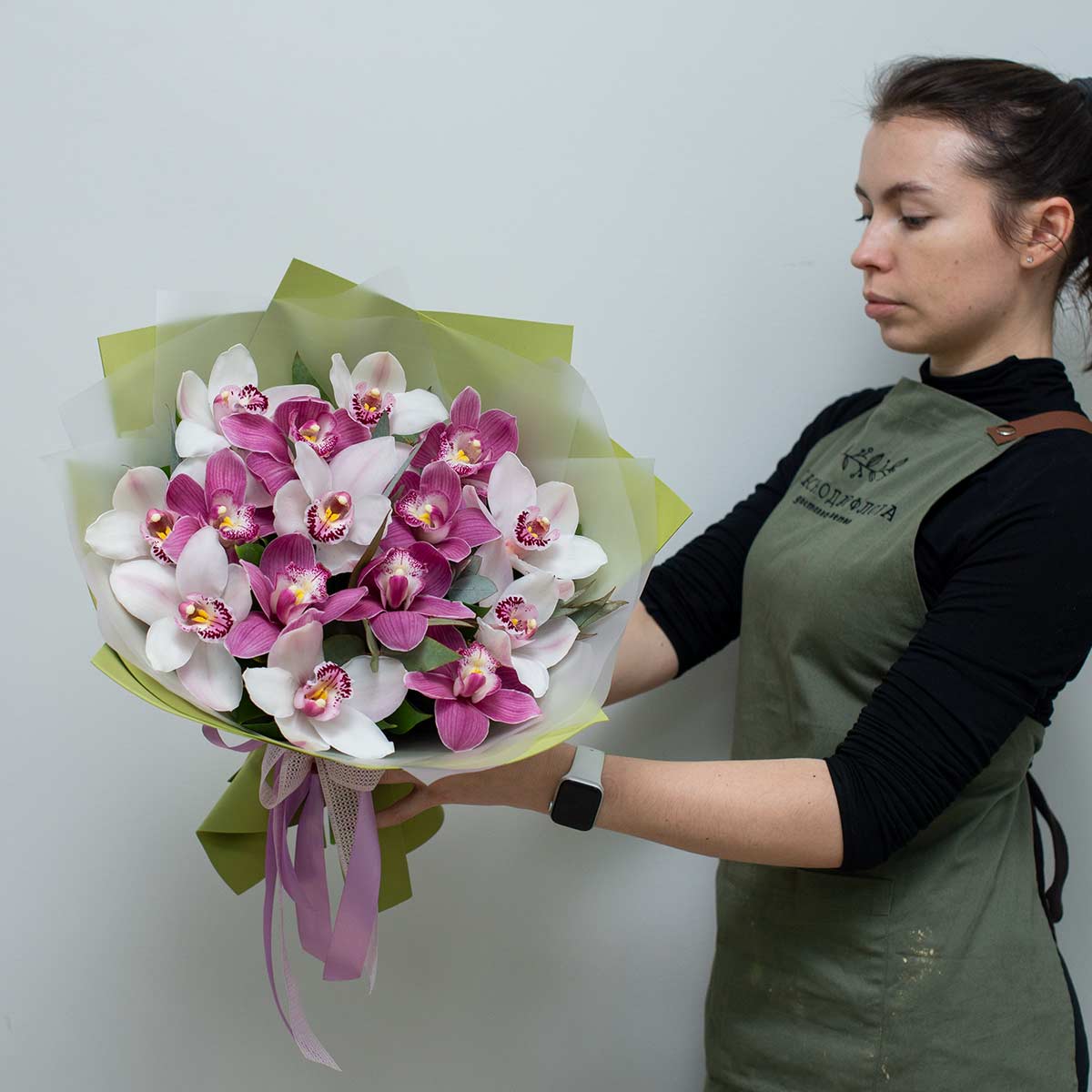 Букет из 15 цветков королевской изящной орхидеи цимбидиум на удлинителях с зеленью рускус, эвкалипт. Упаковка: жатая бумагаПримерный размер букета: 35*35 см