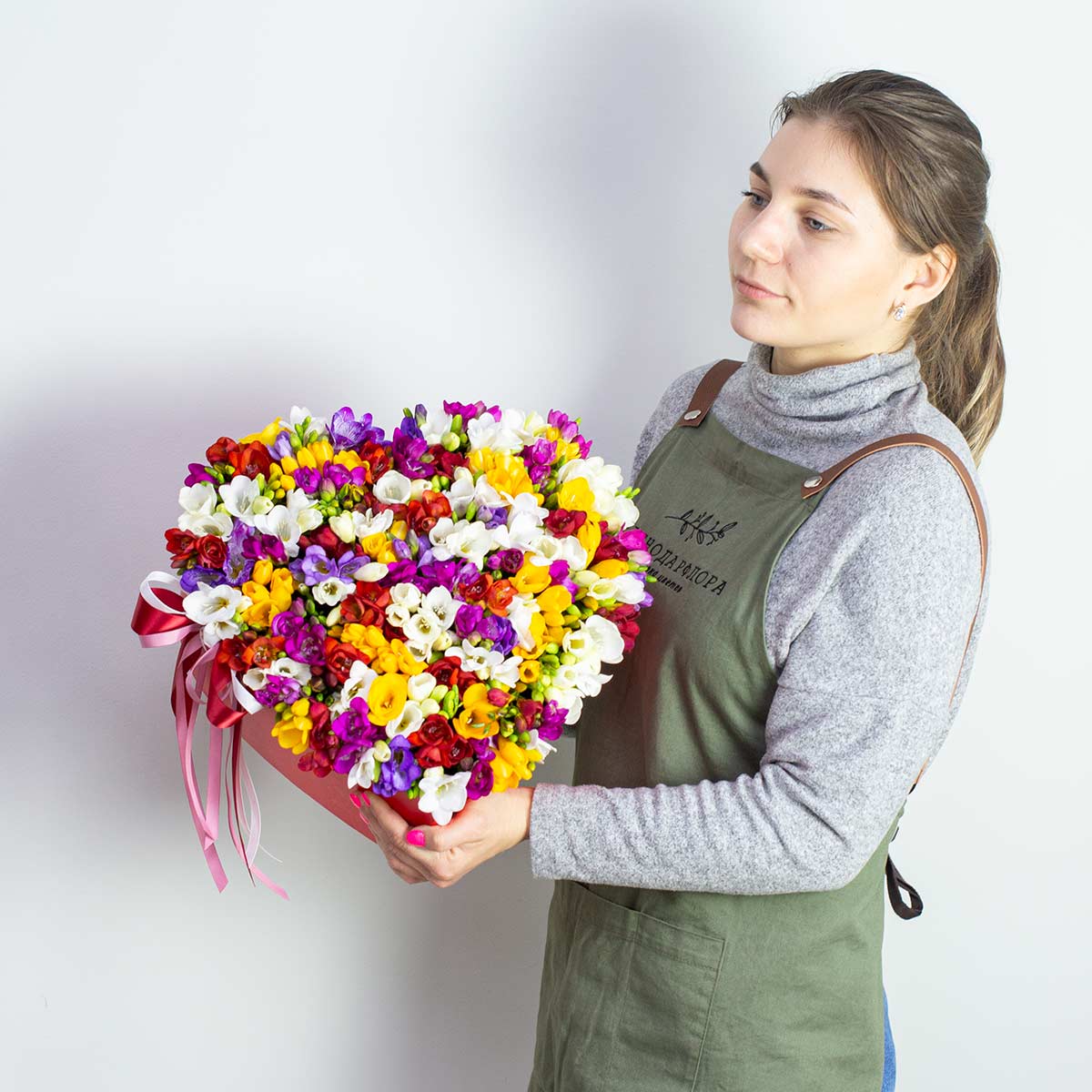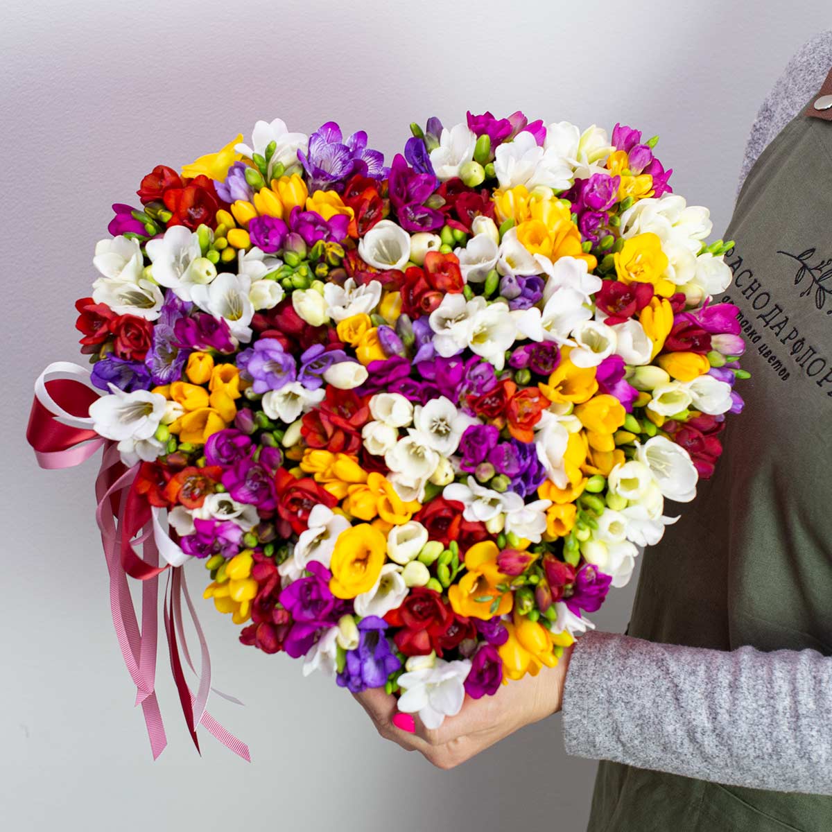 Коробка в виде сердца с ароматными разноцветными фрезиямиСостав композиции: