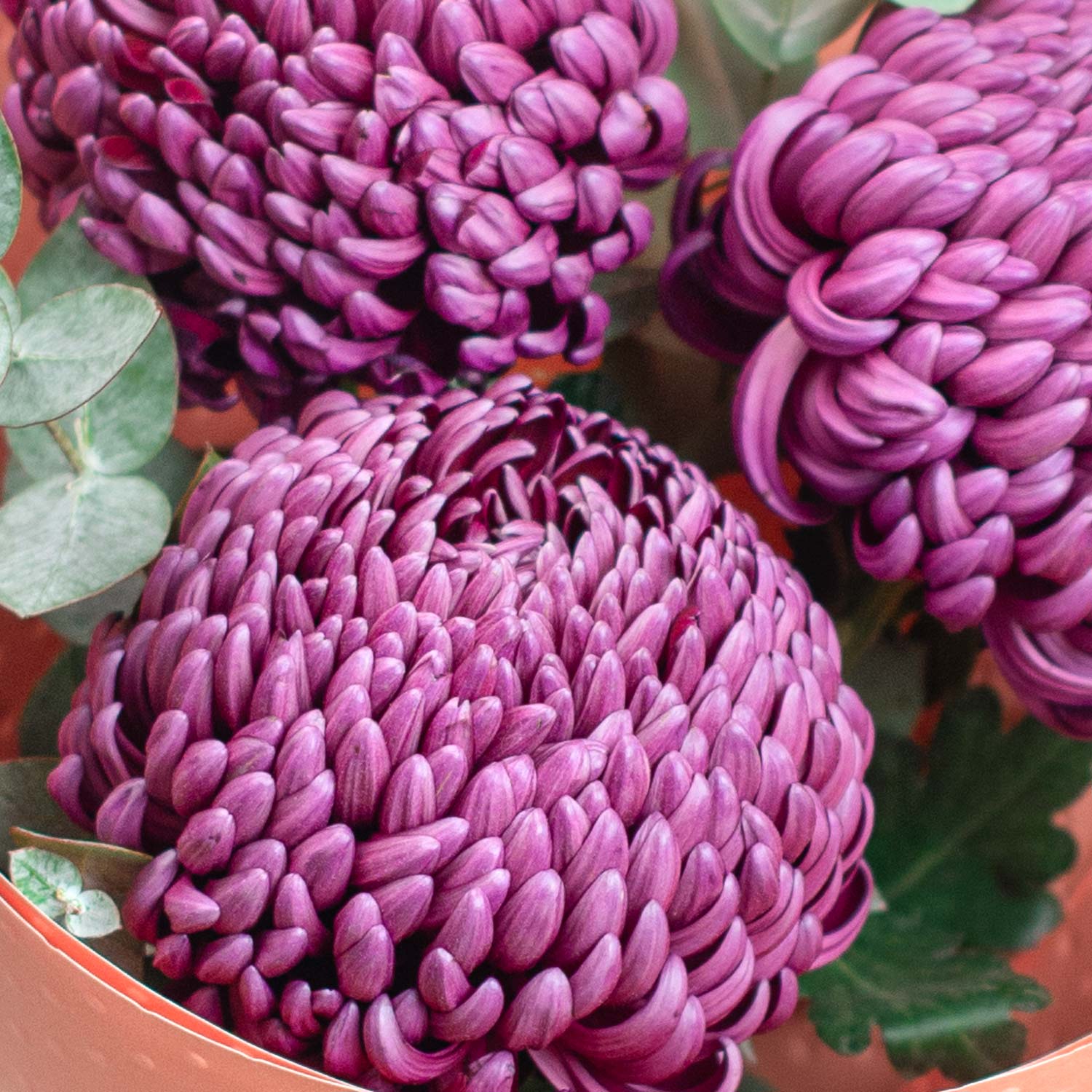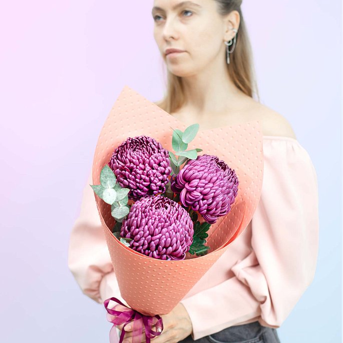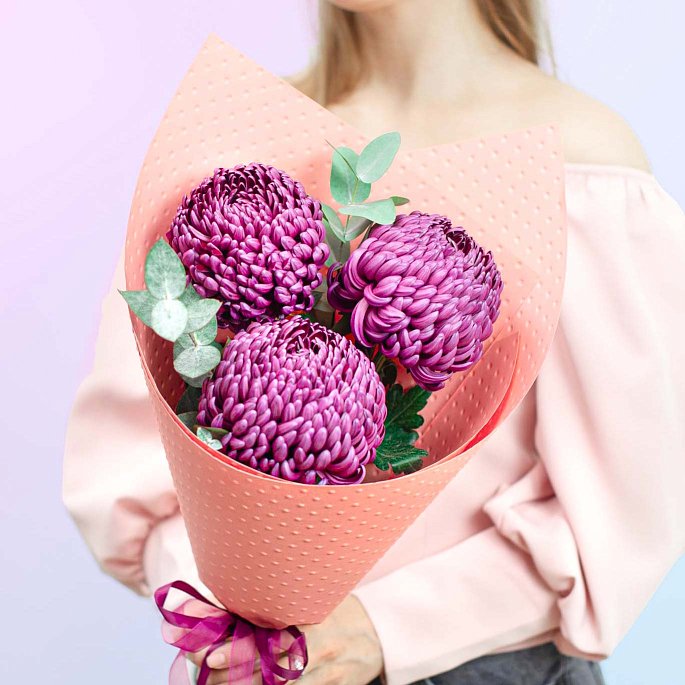 Букеты из 3 крупных осенних хризантем с ароматным эвкалиптом, который предает аромат, объем и фактуру букету.Примерный диаметр букета: 20 см