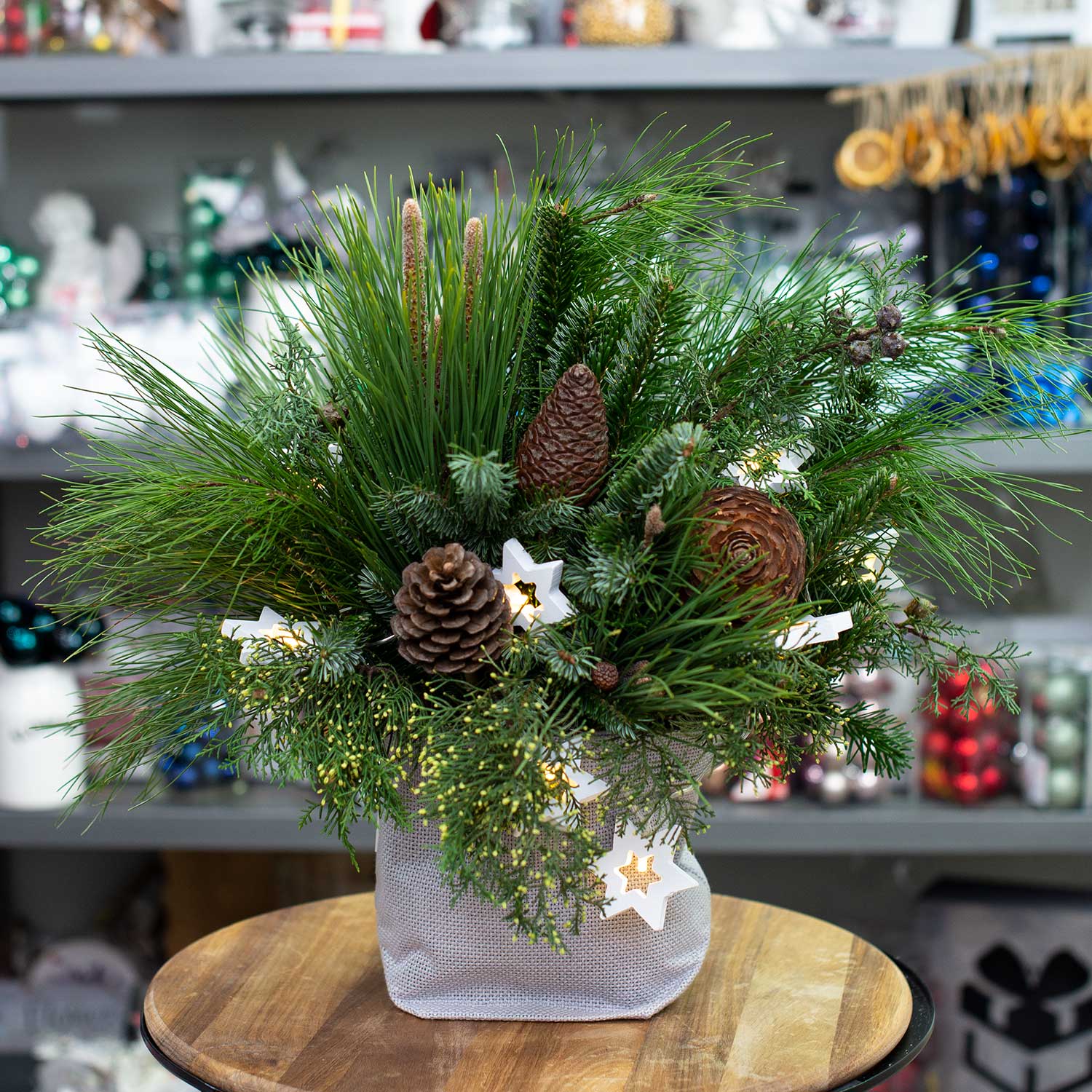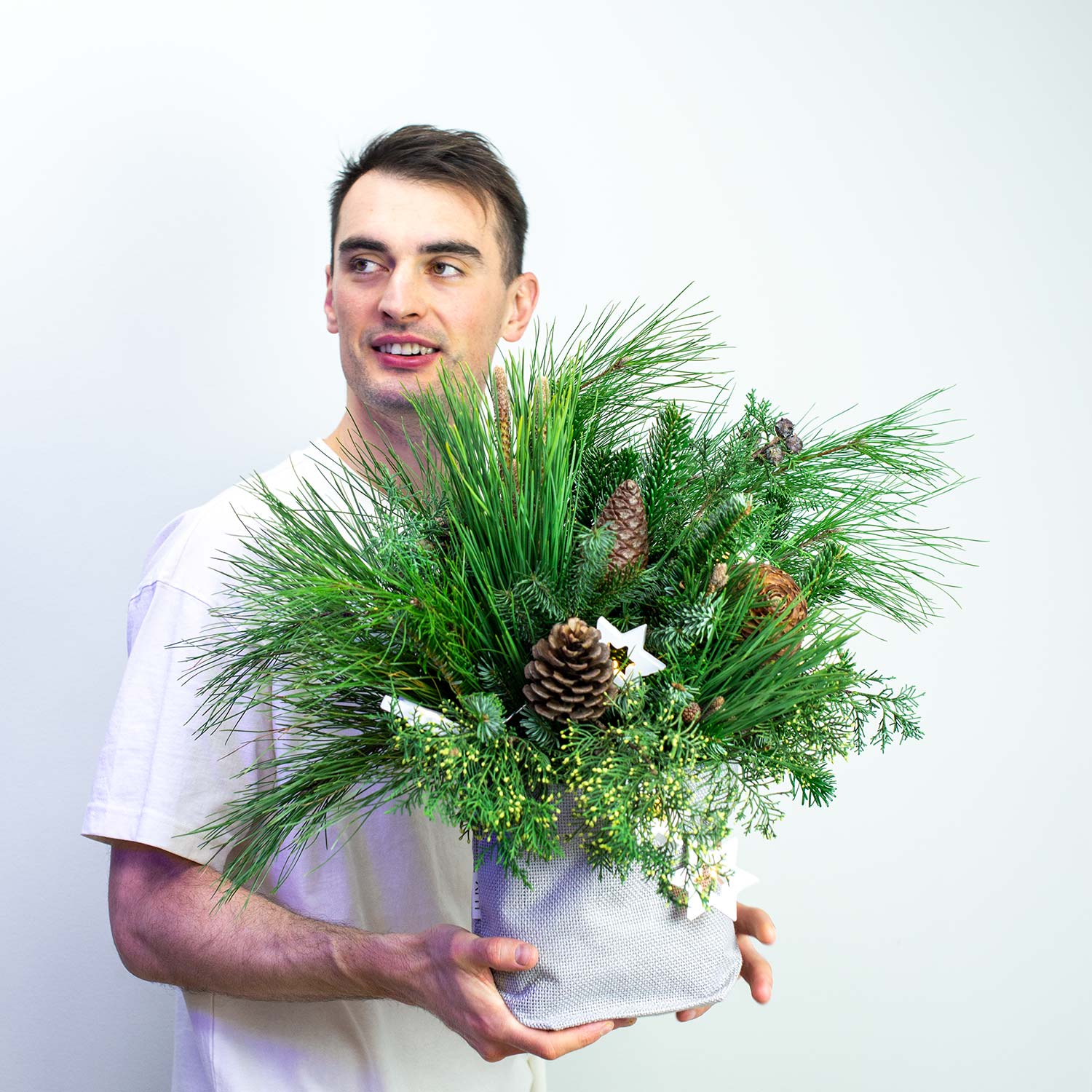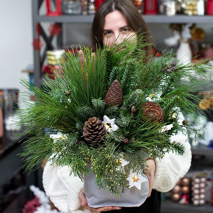 Ветки сосны, ветки пихты, ветки туи, еловые шишки, гирлянда на батарейках, кашпо из ткани.