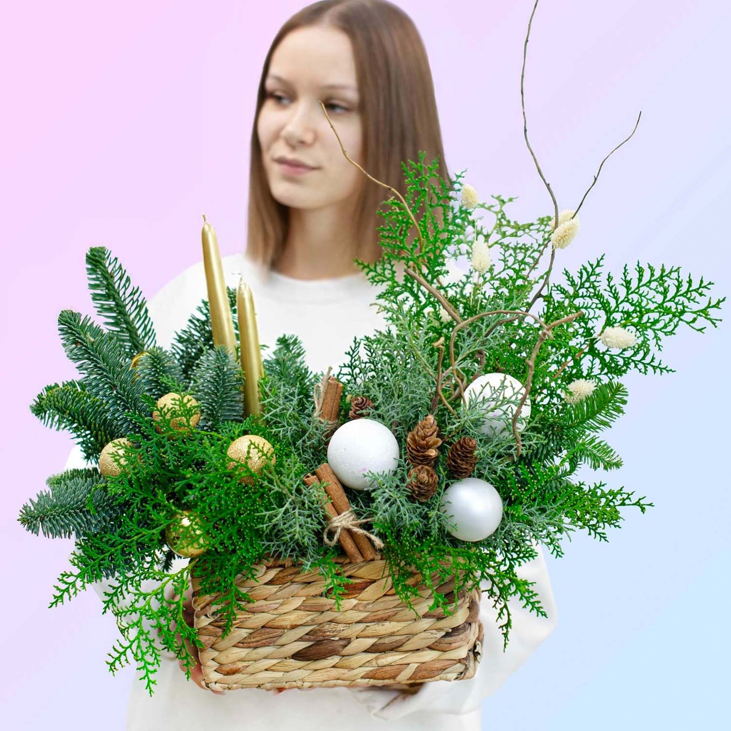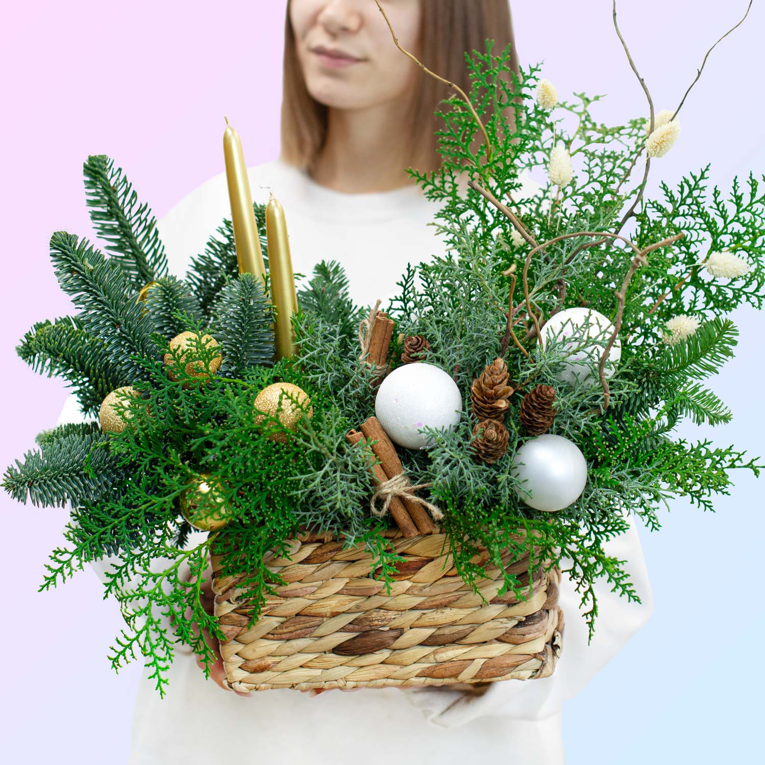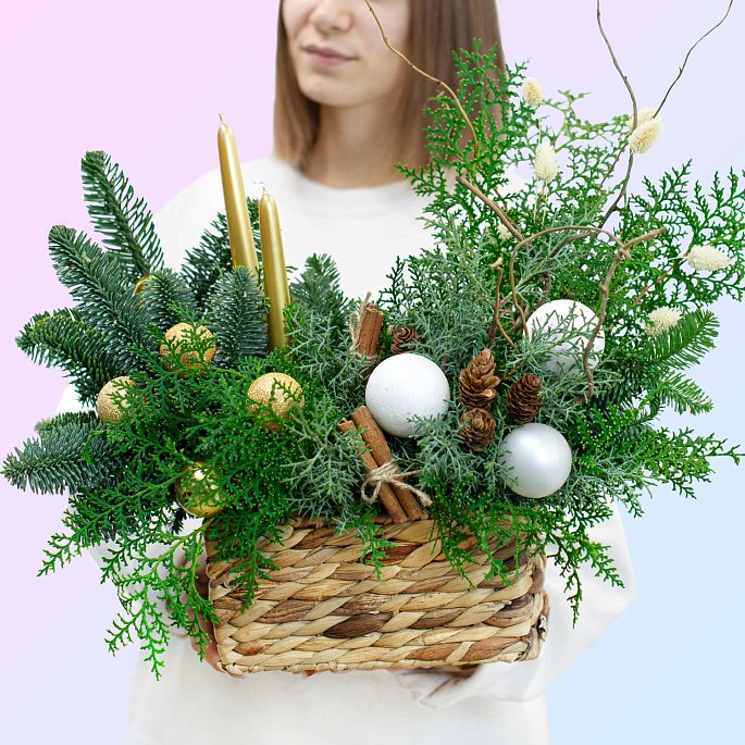 🎄 Эта композиция станет изюминкой вашего новогоднего декора! 🎄"Новогодняя сказка" — это великолепное украшение для праздника, которое сочетает в себе дух Рождества и уют зимних вечеров. Плетёная корзина наполняется ароматной зеленью нобилиса и кипариса, дополненной праздничными деталями: елочными шарами, свечами, корицей и шишками. Каждый элемент композиции продуман, чтобы создать атмосферу тепла и уюта в вашем доме.