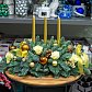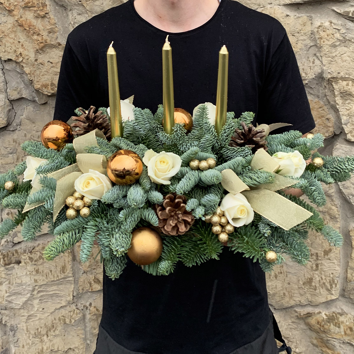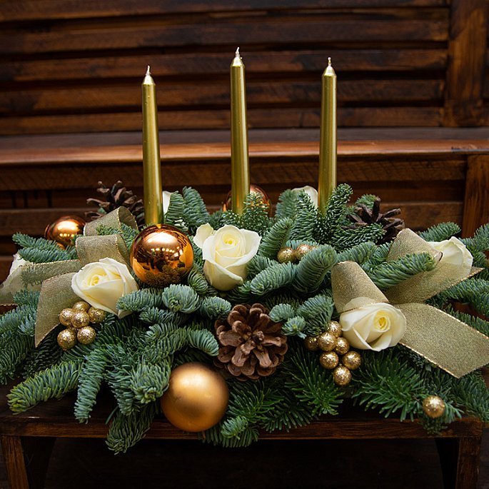 Новогодняя настольная композиция из:7 белых роз, 3 еловых шишек, 4 елочных шаров, еловых веток, бантов, 3 мини-гирлянд золотых шаров, 3 золотых свечей