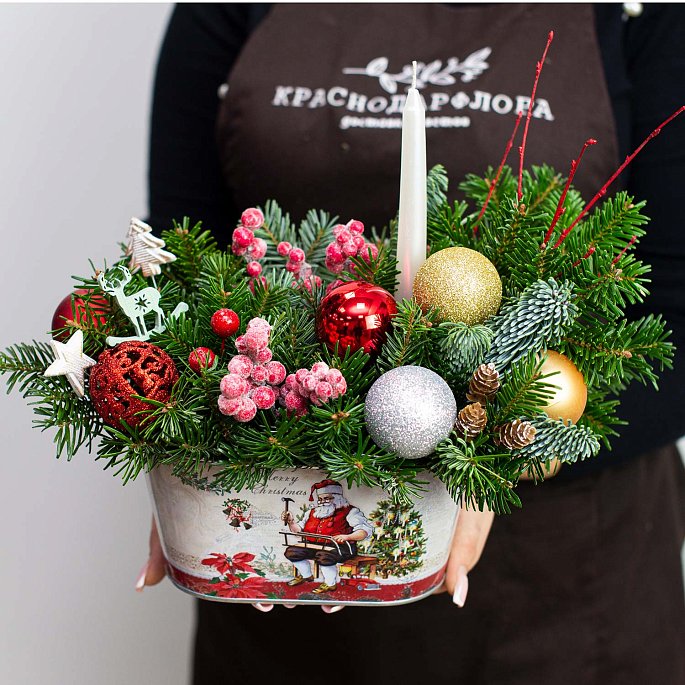 Ящик с рисунком, еловыми ветками, елочными игрушками, свечой и декором.Состав композиции:
