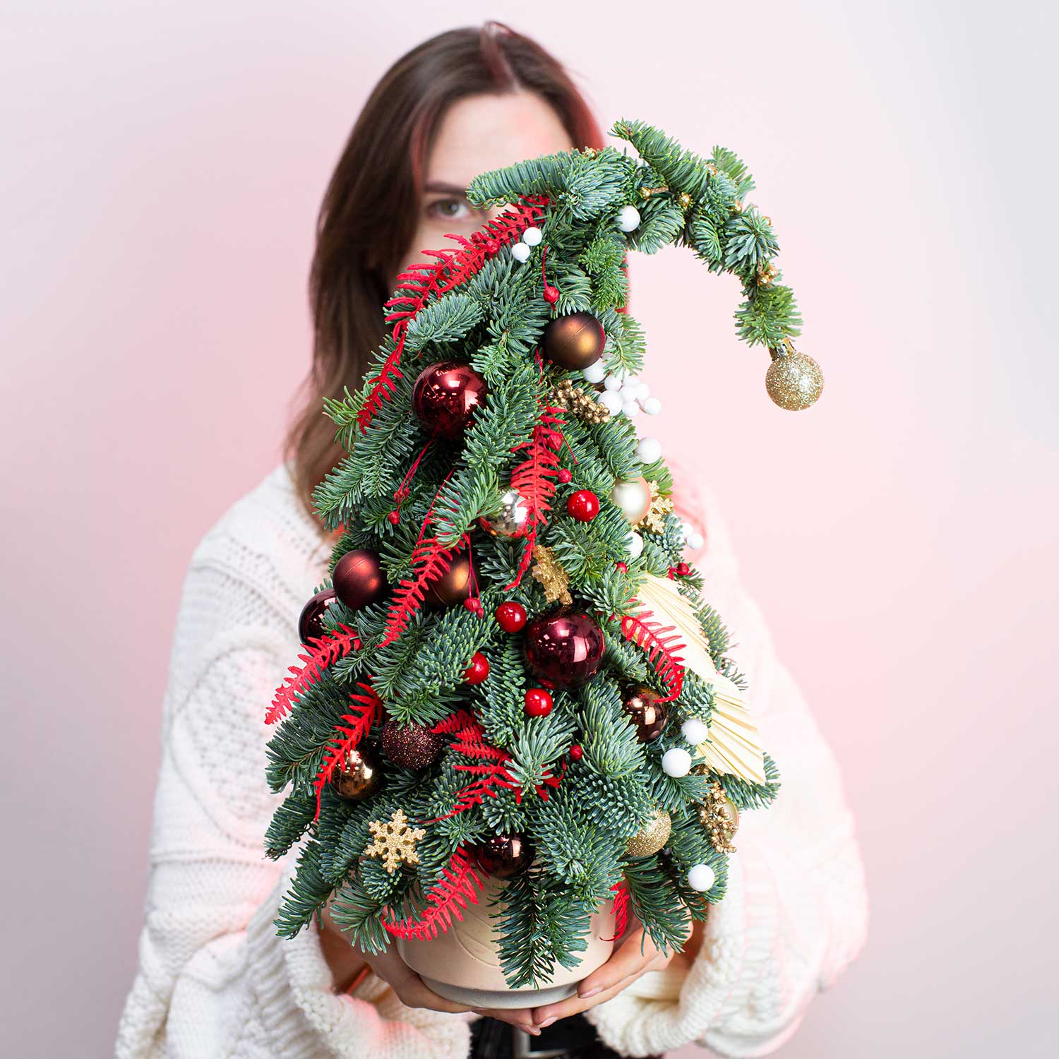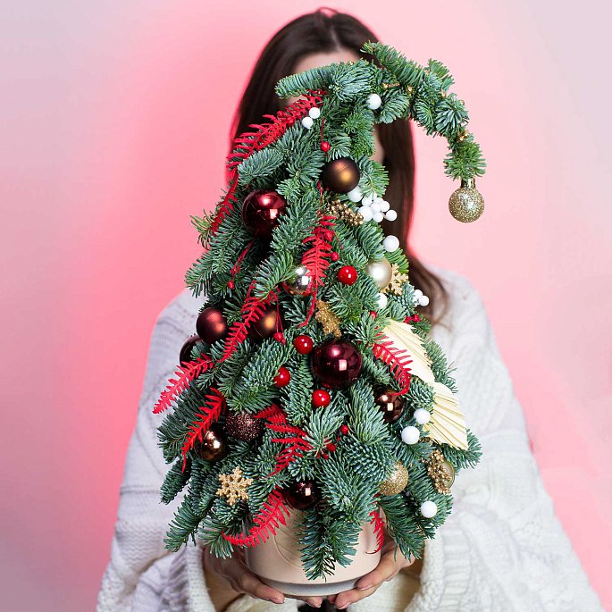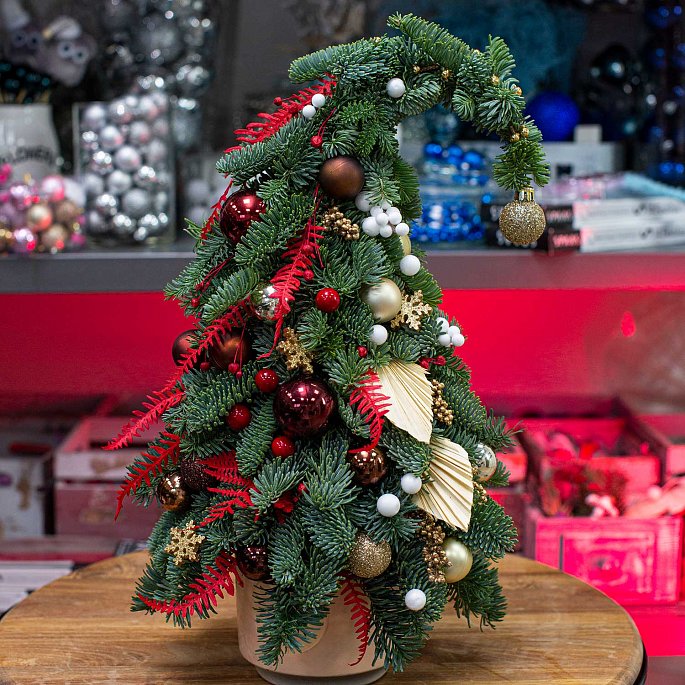 Сказочная флористическая елка из ароматных живых хвойных веток Нобилиса с игрушками в ярких красных тонах с золотыми акцентами, новогодним декором в керамическом горшке. Сверху елка имеет трендовый в 2022 году изгиб.Не осыпается, простоит долго!
