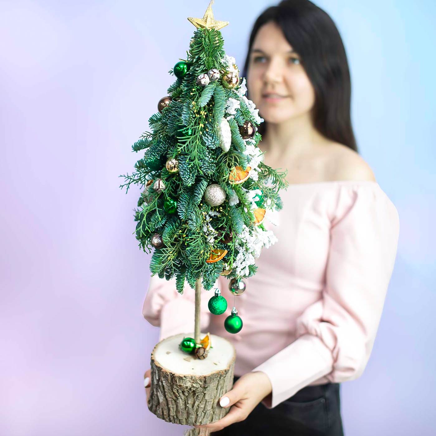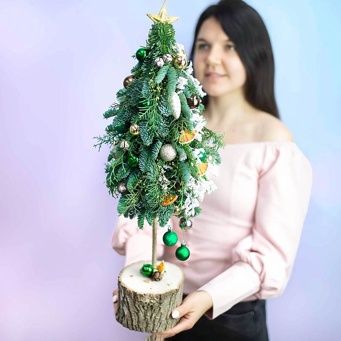 🎄 Композиция "Новогоднее Волшебство" 🎄Уютная новогодняя елочка, украшенная в классических зелёных и золотых тонах, с акцентами в виде оранжевых ломтиков цитрусовых и пушистым снегом.