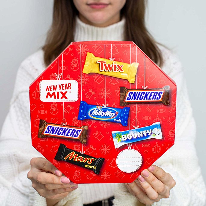 Подарочный набор Minis Mix – подарок на Новый год, который содержит сладости любимых конфет: Snickers, Milky Way, Twix, Mars, Bounty.Состав: