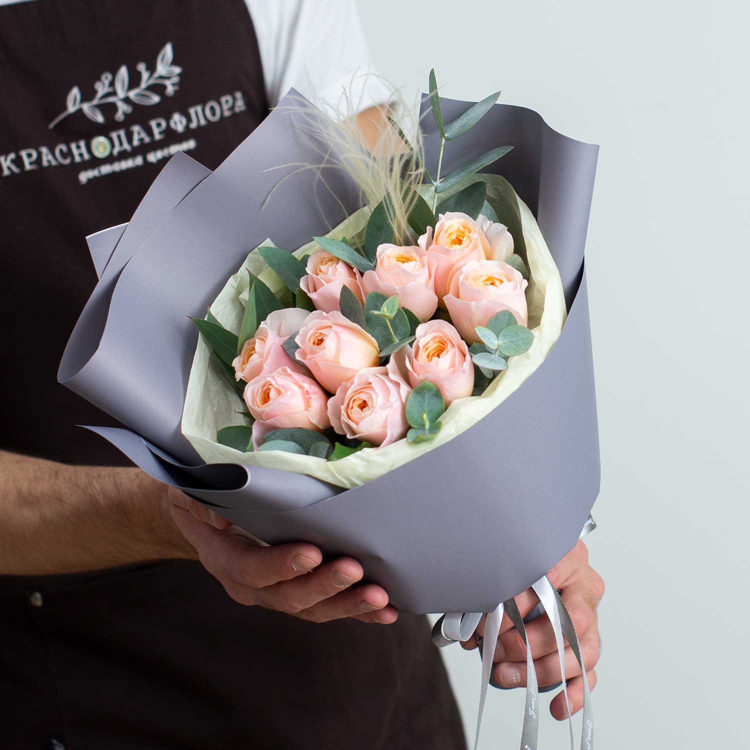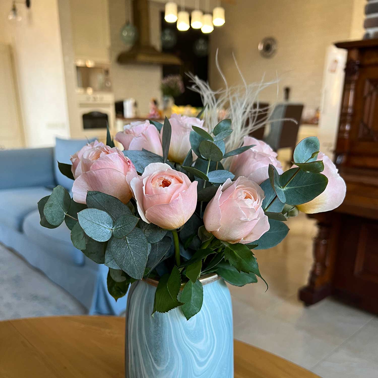 Букет из нежнейших пионовидных роз "Дэвид Остин", дополнен эвкалиптом и воздушными сухоцветами.Когда мы увидели их, то сразу влюбились! Они нежные и воздушные. А как же они круто смотрятся в вазе без упаковки! Мы добавили для примера второе фото в интерьере.
