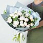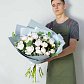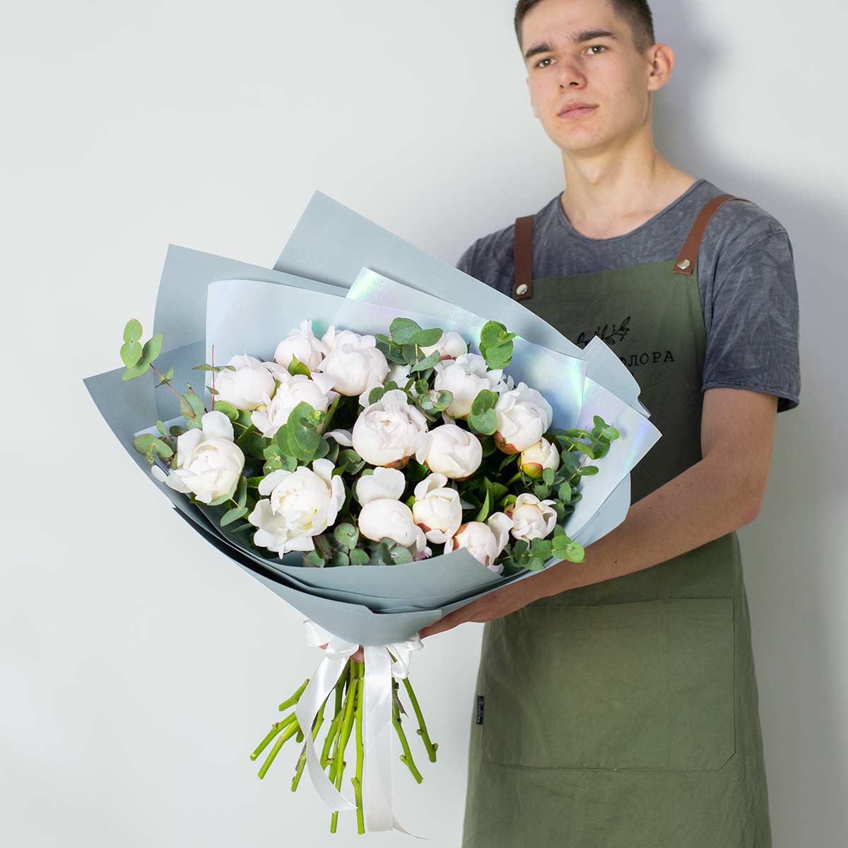 Букет из 19 белых пионов с эвкалиптом "Беби блю" в упаковке серая крафт бумага. Пионы раскроются в воде в течение 1 дня.Размер букета: 35*35 см