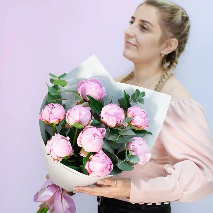 Букет из 9 пионов "Сара Бернар" c эвкалиптом