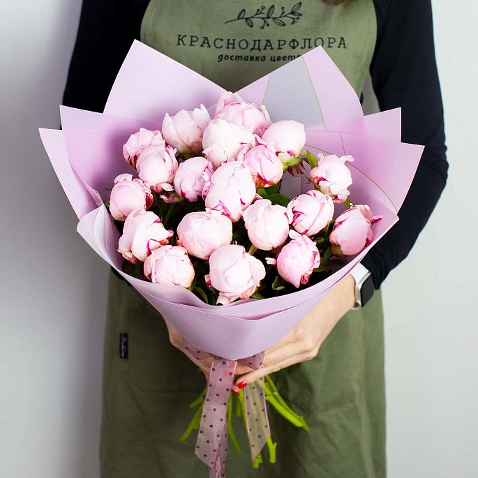 Букет из 19 розовых пионов. Пионы раскрываются в воде и в комнатной температуре в течение дня. Становятся крупными и яркими.Примерный диаметр букета: 30-35 см
