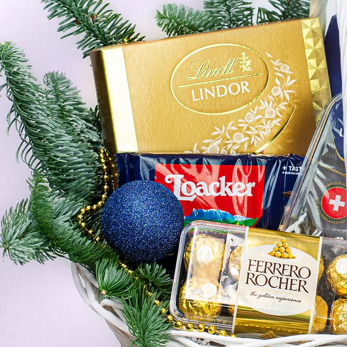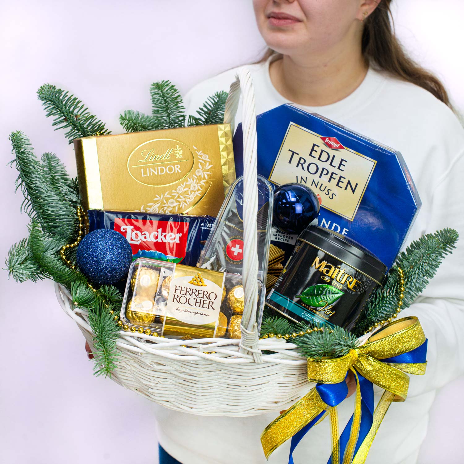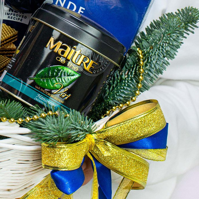 Белая плетеная корзина в золотых и голубых тонах.Состав корзины: