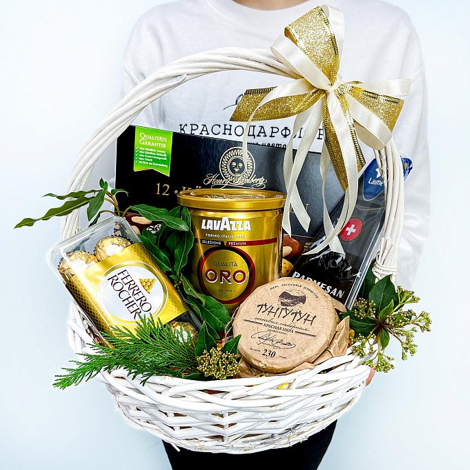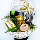 Деревянная плетеная корзина с декором и продуктами.Состав корзины: