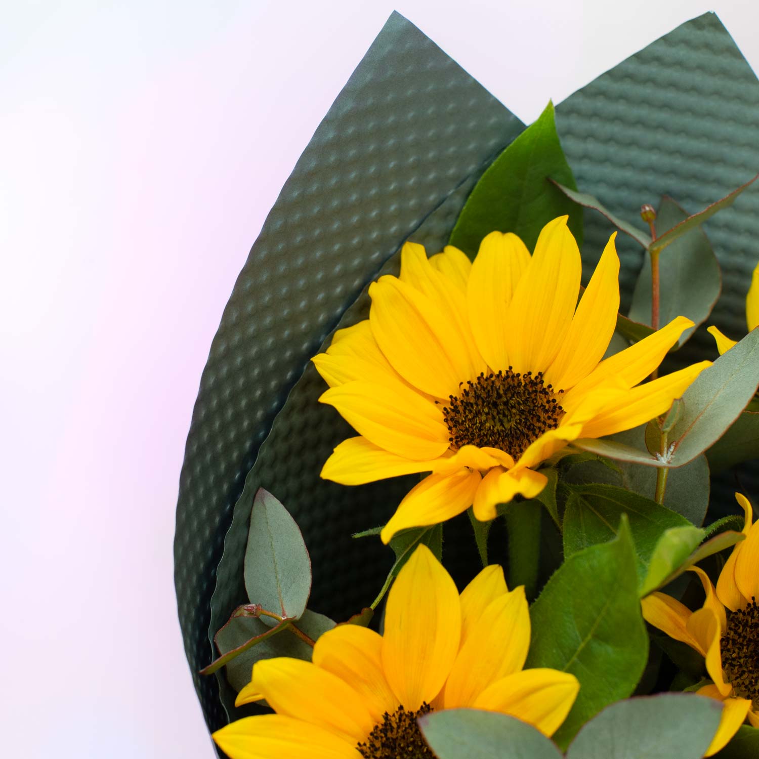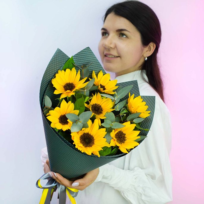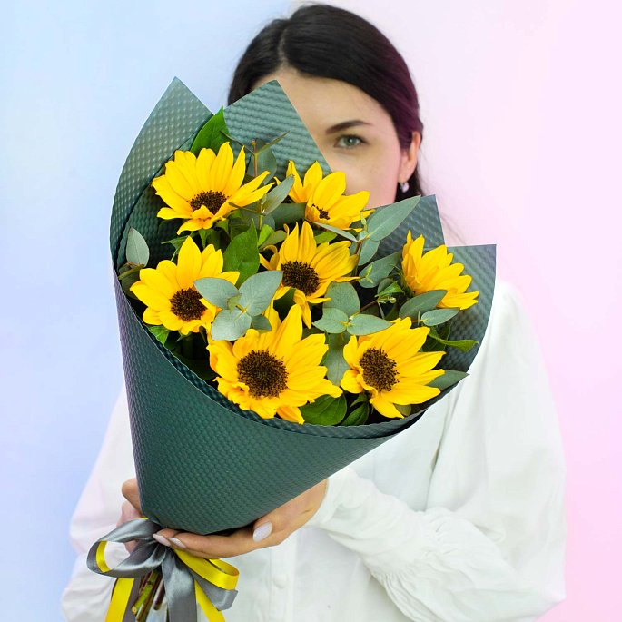 Подарите улыбку и солнечное настроение с букетом из 7 подсолнухов, дополненным свежим эвкалиптом. Это жизнерадостное и яркое сочетание подарит тепло и позитив, идеально подходя для любого повода.Примерный размер букета: 25*25 см