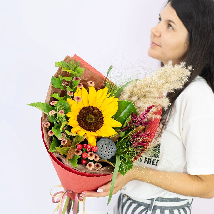 Наша сентябрьская коллекция: букет из подсолнуха, кустовых хризантем, ягод и вариативной осенней зелени.Примерный диаметр букета: 20-25 см