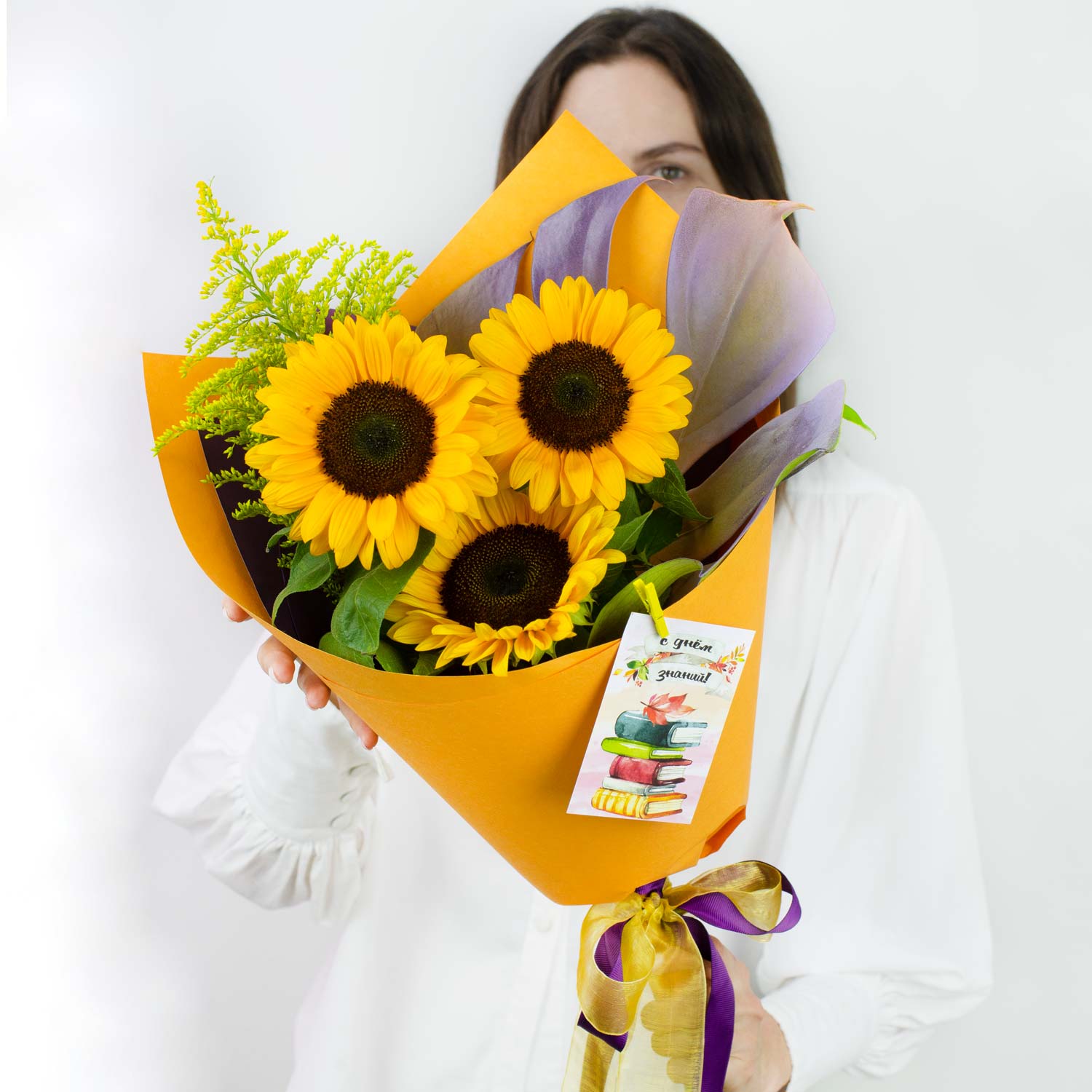 Наша сентябрьская коллекция: букет из 3 подсолнухов c контрастным декором из листа монстеры и солидаго.Примерный размер букета: 25*25 см