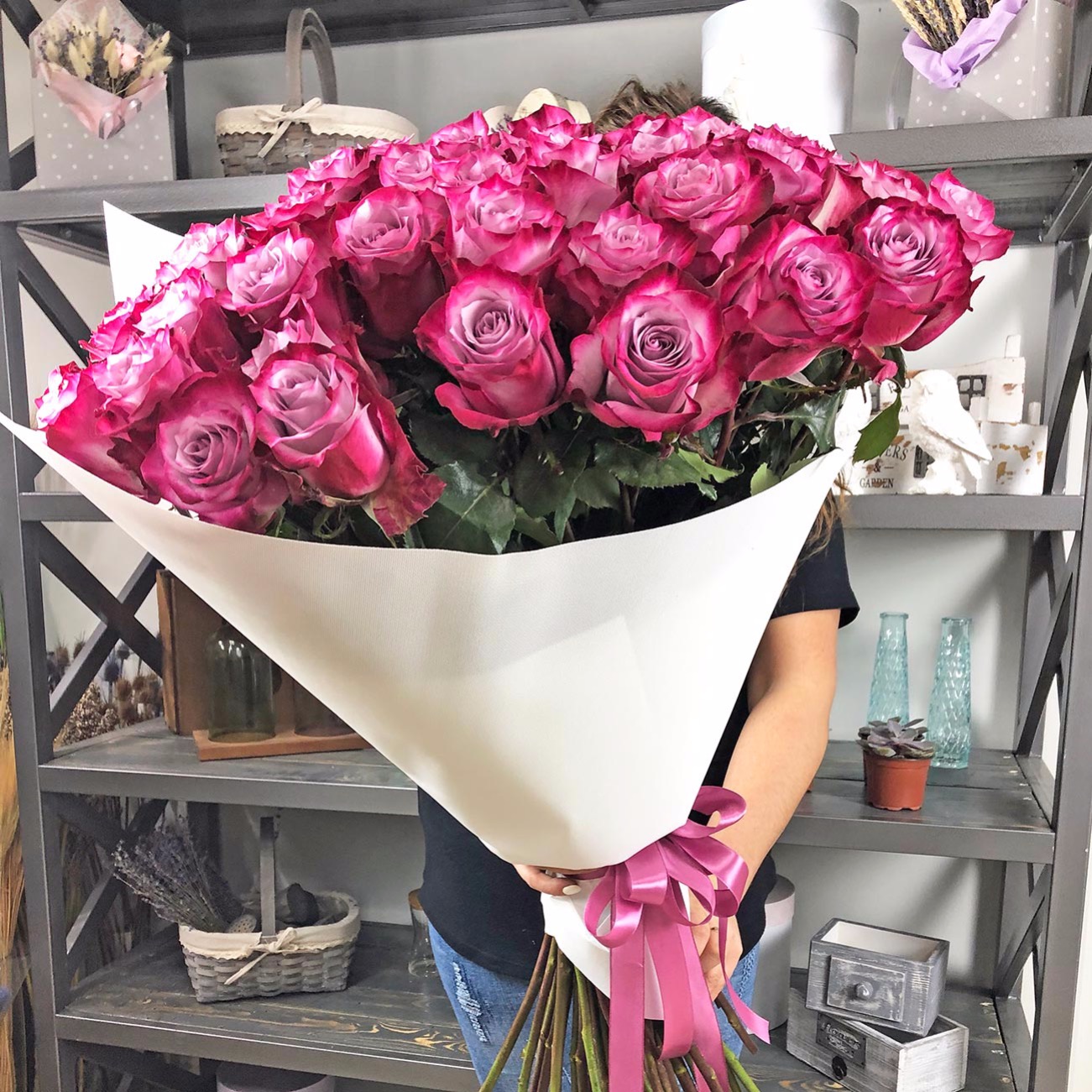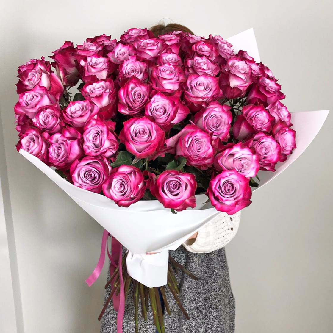 51 роза сорт "Дип Перпл"Необычный малиново-розовый с лиловым оттенком и пунцовым переходом цвет розы идеально гармонирует с очень пышной бокаловидной формой бутона. Аромат розы легкий, с легкой романтической ноткой.