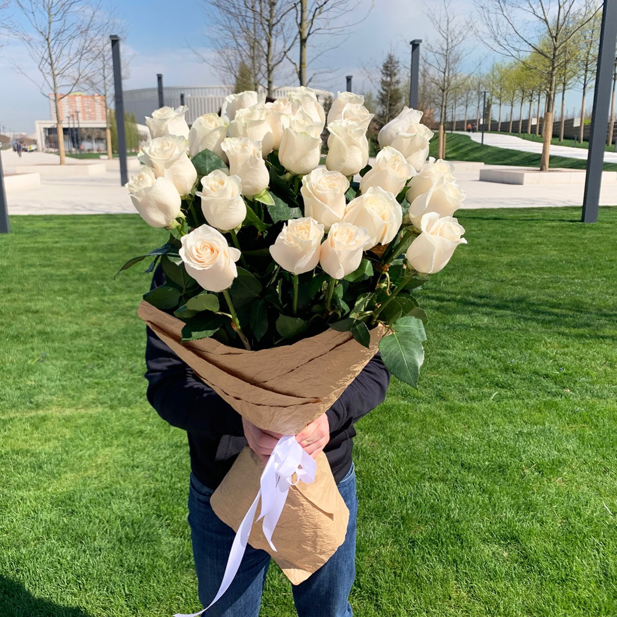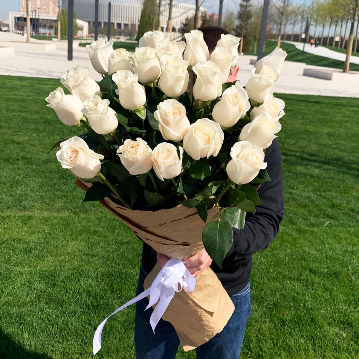 Букет из классической импортной розы. 25 белых роз, в упаковке жатая бумага. Высота роз - 80-90 см.Уход за букетом: смена воды два раза в день, подрезать стебли 3 раза в день. Можно добавить в воду кризал. Прохладное помещение с циркуляцией воздуха. Выполнение рекомендаций позволит букету дольше оставаться свежим и радовать получателя как можно дольше.