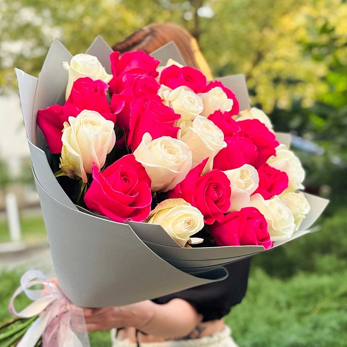 Стильная и гармоничная композиция из роскошных эквадорских роз двух контрастных оттенков: яркого малинового и молочного. Крупные бутоны и насыщенные цвета делают этот букет выразительным и запоминающимся подарком.