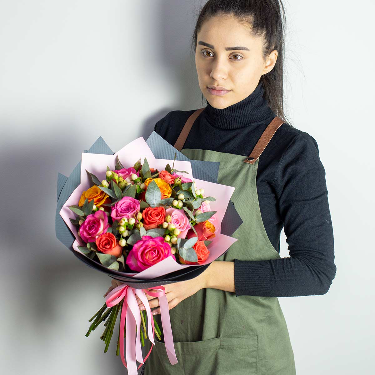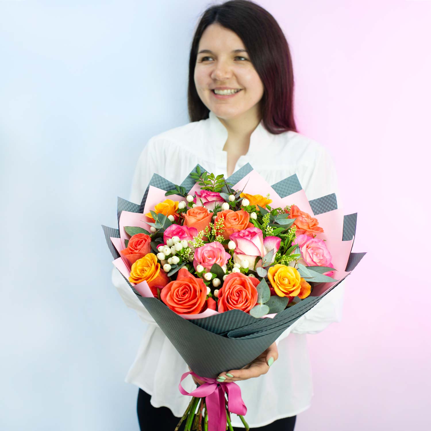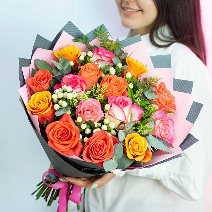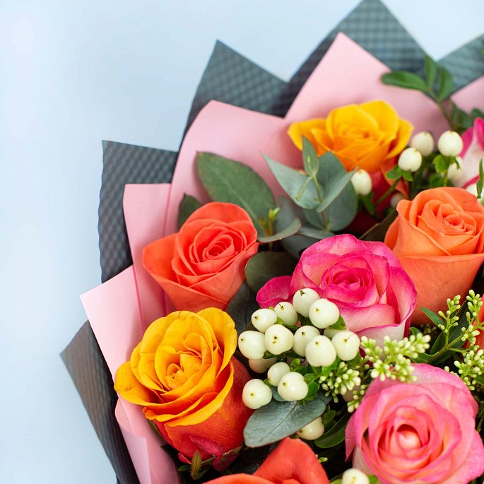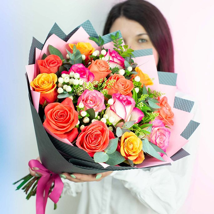 Букет из 15 разноцветных роз "Розомания"